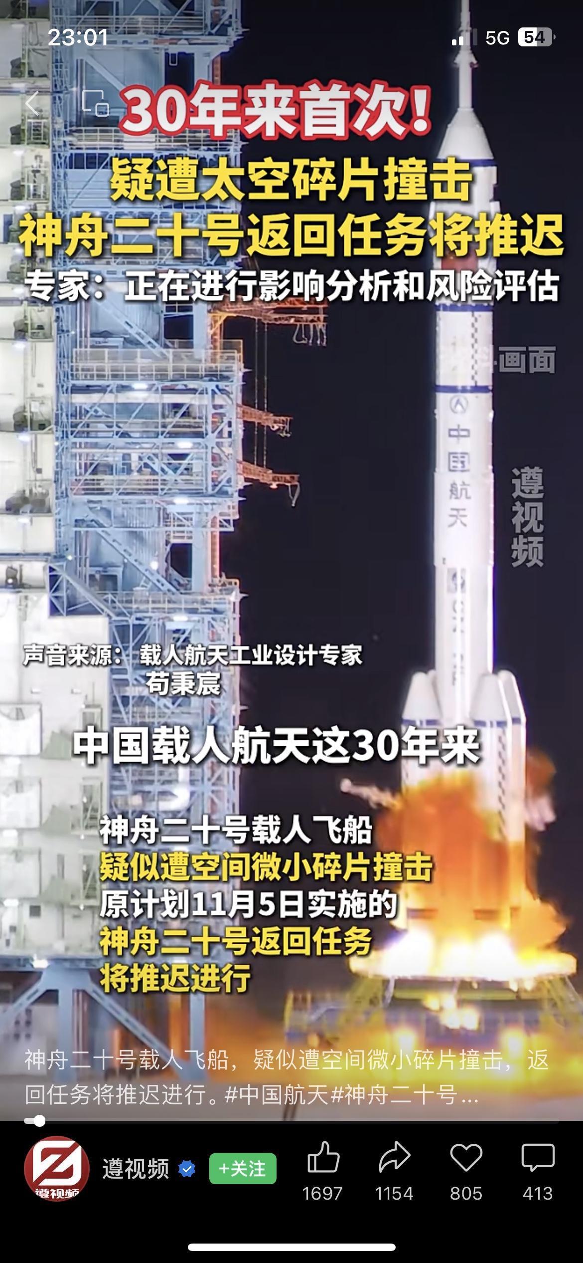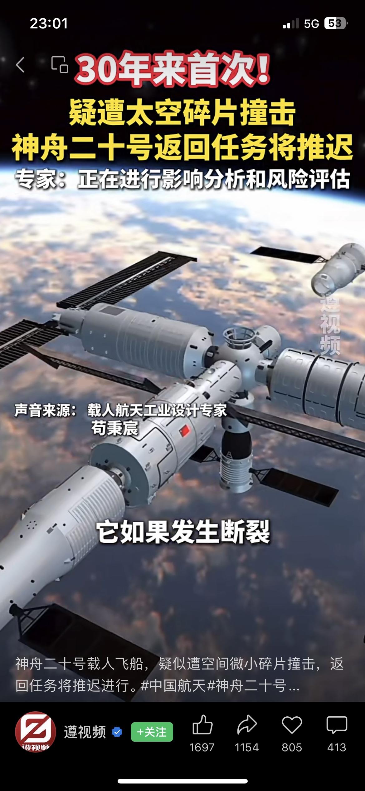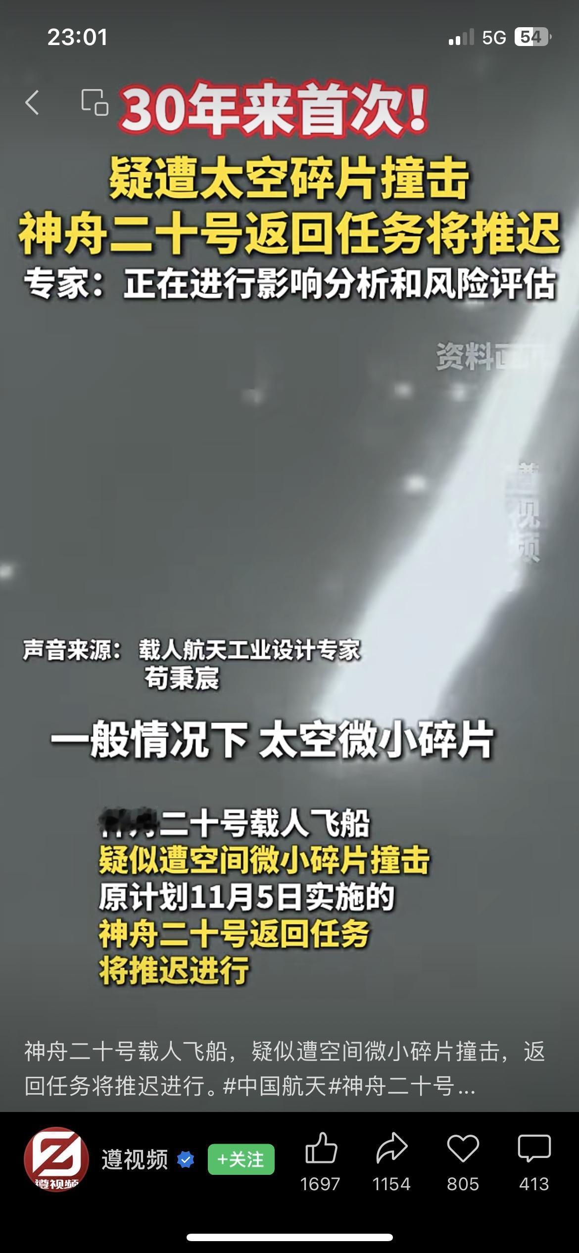 30年首例!神舟二十号返回突然推迟 刚刷到重磅消息:神舟二十号疑似遭太空碎片撞击,原计划11月5日的返回任务直接推迟! 这可是中国载人航天30年来头一回遇到这情况,专家正紧急评估风险。咱航天员在天上肯定安全吧?心里真捏把汗! 换你是地面指挥,这时候会优先保返回还是先排险? 转给关心航天的朋友,一起等官方最新通报!神舟二十一号