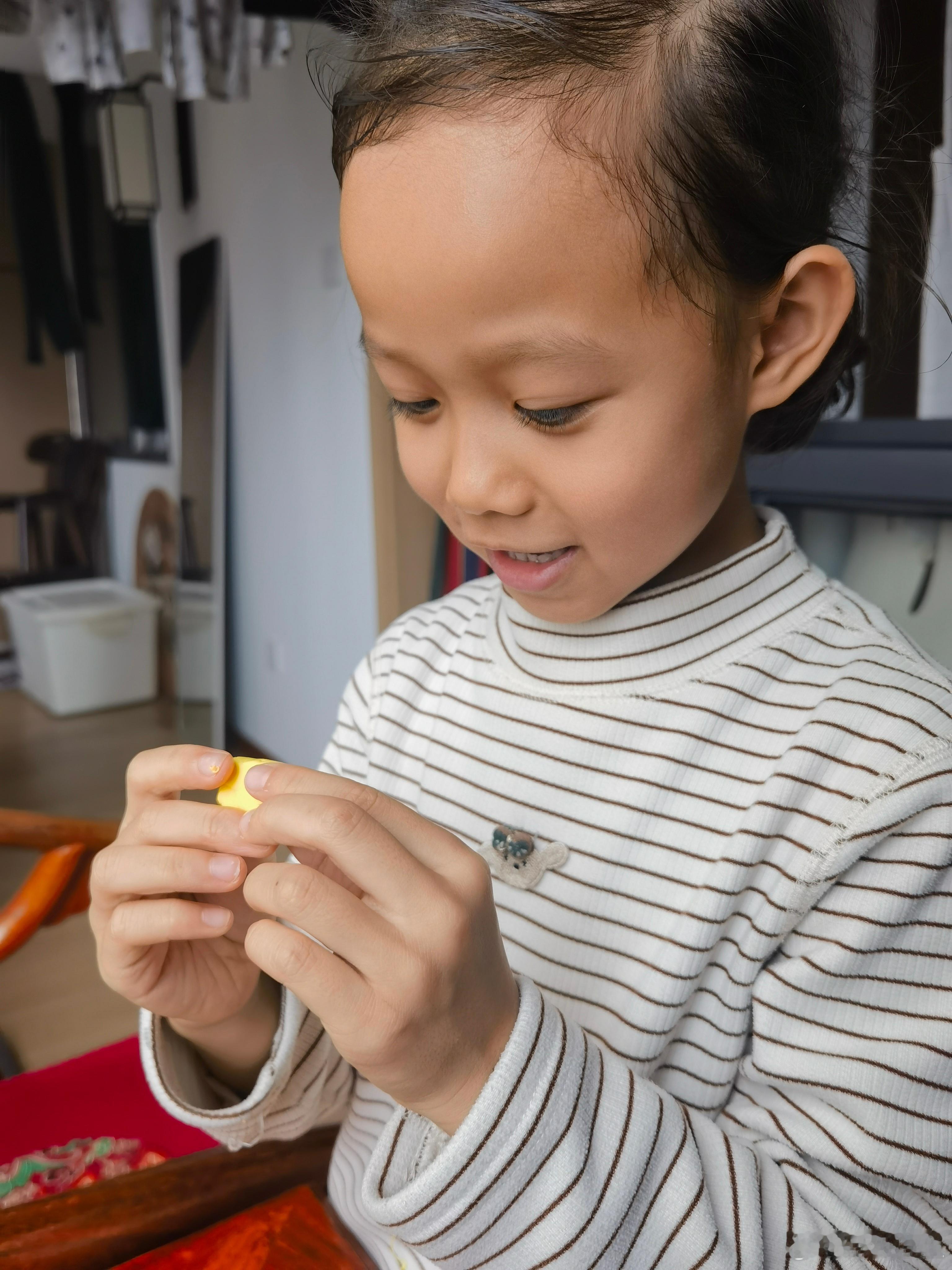 那双小手的动作,竟和二十年前芊芊玩粘土时一般无二,和六十年前我的小手里捏着泥巴面人时也一般无二。只是我们那时是井台边的黄泥,是母亲调了胭脂的面团;如今子月掌间流转的,是装在塑料盒里的七彩粘土。红的像火,蓝的像海,还有荧荧的闪着星光的——我们那时哪里见过这般齐整的颜色呢?
