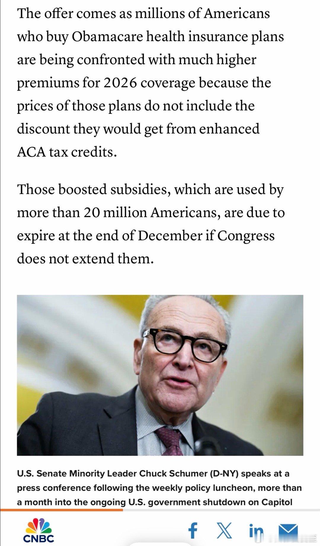 民主党参院领袖提出:只要共和党同意“今年底将到期的医保补贴再续一年”,就可以停止“政府关门”