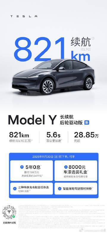 特斯拉也开始年底冲量了,Model Y新出了一个长续航后驱版,CLTC续航821公里,售价28.85万。各种权益也不少,包括:五年免息、八千选装还有FSD转移,大家觉得这车会成为新的爆款吗?【来自懂车帝车友圈】