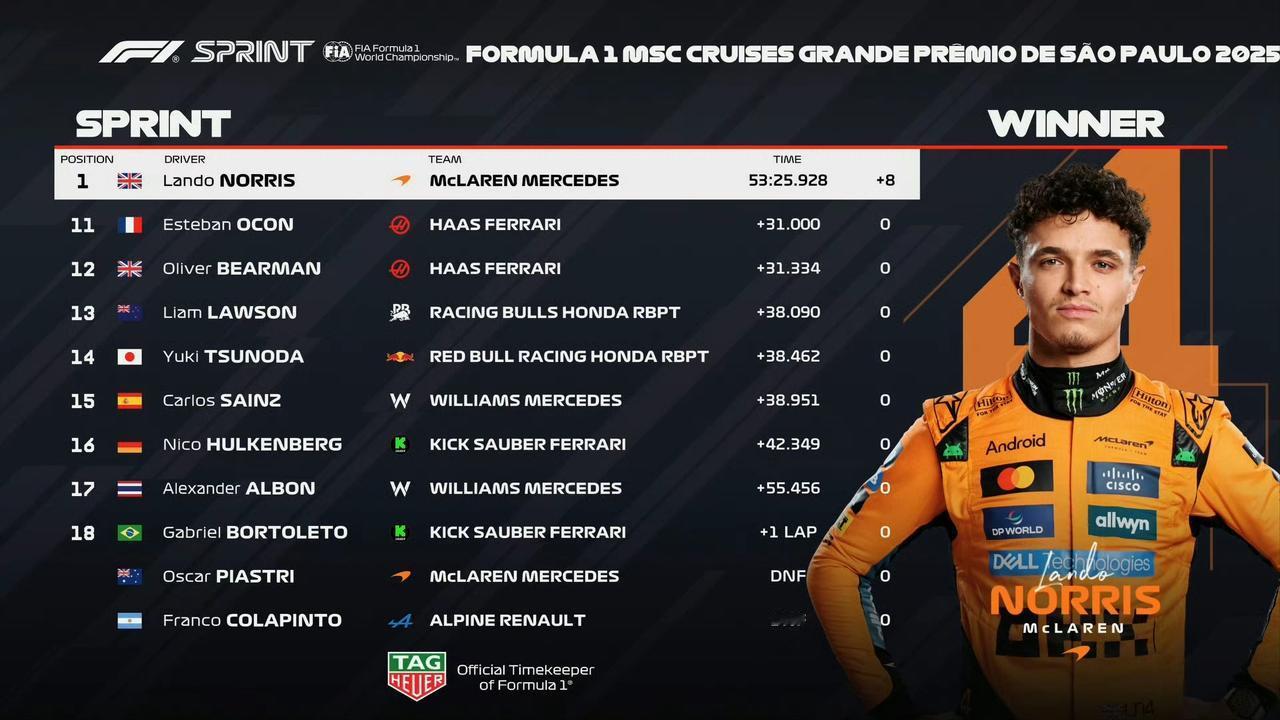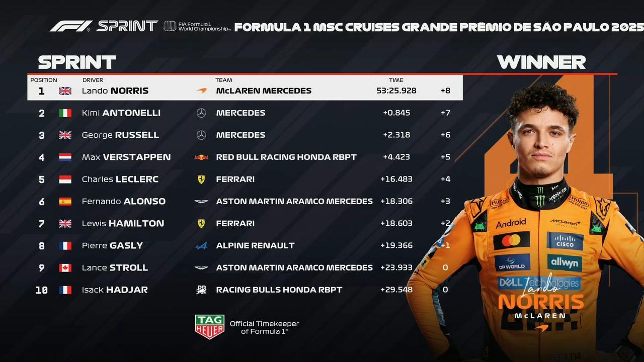 诺里斯赢下圣保罗冲刺赛,与皮亚拉大到9分差距,争冠车手皮亚斯特里撞墙再次退赛。 安东内利第二、拉塞尔第三;法拉利双雄位列第5、7,因此梅赛德斯积分榜升至第二,法拉利第三。