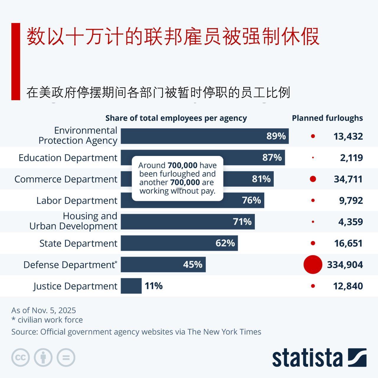 美国政府停摆产生的影响有多大? 到周五(11月7日),美国政府停摆已持续了 38 天,成为美国历史上持续时间最长的政府停摆事件。此次停摆带来的影响十分广泛,补充营养援助计划(SNAP)下的食品补助已于周末停止发放。尽管一名法官已下令特朗普政府在周五之前全额拨付 11 月份的食品券资金,但政府方面却请求上诉法院阻止这一裁决。与此同时,约 140 万联邦雇员处于无薪休假或无薪工作的状态,直至资金恢复到位;此外,由于空中交通管制安全方面的担忧,美国 40 个主要机场的 10%的航班已被取消。特朗普对此事件的回应是呼吁共和党人废除要求立法通过需获得 60 票多数支持的参议院冗长辩论规则。 民意调查公司“YouGov”近期开展的一系列调查表明,认为自己因政府停摆而受到直接影响的美国成年人数量正在不断增加。这一情况在民主党人和共和党人中均存在,不过民主党人中这种影响的程度更为严重。10 月 10 日,美国总体受访者中有 21%表示自己在一定程度上或很大程度上受到了政府停摆的影响。截至 10 月 31 日,这一比例已升至 36%。 对于此次政府停摆事件的责任归属,美国人意见不一。35%的人认为是国会中的共和党人应承担主要责任,32%的人认为是国会中的民主党人应承担责任,还有 28%的人认为两党都有责任。与此同时,近几周来,民众对特朗普处理此次停摆事件的总体认可度有所下降。在关于“补充营养援助计划”福利发放的问题上,约四分之三的美国成年人表示在政府停摆期间应继续发放这些福利。 自 10 月 1 日美国政府停摆以来,约 70 万名联邦雇员已面临无薪休假,另有 70 万名联邦雇员在停摆期间一直无薪工作。随着停摆进入第二个月,食品银行接待的求助者人数大幅增加,其中包括那些没有领到薪水的联邦工作人员。 《纽约时报》的一项分析揭示了民众生计受到严重影响的程度。在五个部门——环境保护署、教育部、商务部、劳工部和住房与城市发展部——有 71%至 89%的员工被暂时停职。按绝对人数计算,仅这五个部门就有超过 64,400 人受到影响。而众多活动中的部分已陷入停滞,比如人口普查局的工作、住房歧视投诉的审查以及劳工统计局的数据发布等。 但如下面图表所示,这一庞大的数字在与国防部的员工队伍规模相比之下仍显得微不足道。国防部有近 33.5 万名员工被暂时停职。《纽约时报》的记者还发现,在卫生与公众服务部,有 32460 人受到停职影响(占该部门总人数的 41%),其中一些活动将停止,包括美国国立卫生研究院医院接收新病人的业务、疾病控制与预防中心向公众发布的信息以及向州和地方卫生部门提供有关公共卫生事务的指导,此外还有食品药品监督管理局对一些新药物和医疗器械申请的审批工作。 随着政府停摆的持续进行,有几类联邦工作人员明显未被纳入强制休假的范围,其中包括联邦执法人员和移民官员。