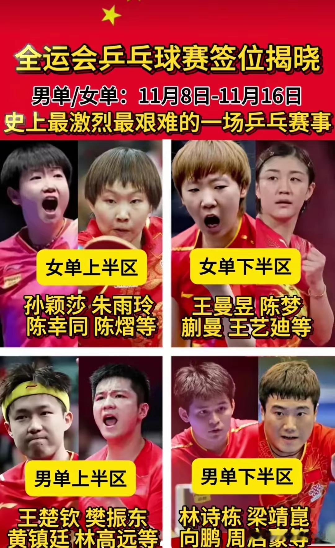 全运会乒乓球比赛堪称神仙打架,众多世界冠军争夺一个全运会冠军,想想就刺激,真是全运会比奥运会都难打。看看如下的这些名字和获得的荣誉,你就知道全运会乒乓球比赛有多令人期待了。 央视也是深知这一点,从今天开始,全程直播乒乓球比赛。球迷可要看过瘾了。 马龙职业生涯共获得31个世界冠军,其中有6个奥运会冠军,14个世乒赛冠军和11个世界杯冠军。 樊振东一共获得25个世界冠军,其中有3个奥运会冠军,7个世乒赛,8个世界杯,2个国际乒联总决赛和5个WTT赛事冠军。 王楚钦一共获得15个世界冠军,其中有2个奥运会冠军,5个世锦赛冠军,2个世界杯冠军和6个WTT大满贯冠军。 徐昕共获得过20个世界冠军,其中2个奥运会冠军,10个世乒赛冠军和8个世界杯冠军。 另外还有林高远,梁靖崑这些前世界冠军成员以及现在的林诗栋,向鹏,陈垣宇这些世界级的年轻球员。 女乒更是不得了,世界前五都在中国,包括孙颖莎,王曼昱,陈幸同,蒯曼和王艺迪,除了他们之外,还有这两年展露头脚的陈熠,钱天一,石洵瑶,何卓佳等等,另外还有代表中国澳门出战的前世界第一朱雨玲以及处于半退役状态为了全运会而复出的陈梦。这些球员任何一人获得的世界冠军都是数不胜数。 看来想要在全运会上收获冠军,真是难于上青天,不仅拼实力,看来还要加上运气,谁能笑到最后 让我们拭目以待吧。