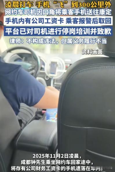 四川成都,有男子凌晨乘坐网约车,上车后将手机放在中控台充电,下车时却忘拿了。男子发现后马上联系司机,让司机掉头送回,还表示愿意出感谢费让司机多赚一份钱。司机称车上有乘客无法掉头,男子心急多说了句话,没想到司机竟直接把手机送到了300公里之外。 据报道,11月6日凌晨,钟先生打网约车回家,路程仅5公里。上车后,他将手机放在中控台充电,到地方开门就下了车。 没走多远,他突然想起手机还在车上,手机里存着公司财务工资卡、自己医保卡等重要信息,丢了后果严重。 钟先生赶紧用另一部手机联系司机,他跟司机说,能不能掉头把手机送回来,自己愿意给二三十块感谢费,就当让司机多赚一份钱。 司机那边说,已经接了新乘客,没法掉头。 钟先生当时就慌了,他以为司机是嫌钱少,想多要点钱才故意这么说,心急之下,他就没控制住情绪,说了些不太好听的话。 钟先生说,你想要多少钱你就直说,别磨唧,说完这话,司机那边没吭声,直接就把电话挂了。 钟先生心里还想着,司机应该是答应了,就在原地等着。 可等了好久,也不见司机回来。 钟先生又给司机打电话,结果发现联系不上了,这是虚拟号,他赶紧找平台,可平台那边也没给出什么有用的消息。 钟先生实在没办法,只好报了警,民警通过车牌,找到了司机王师傅。 民警问王师傅,现在手机在哪里,王师傅说,他已经把手机送到康定某派出所了,民警一查,两地相距300多公里。 原来,王师傅在钟先生报警前就把手机上交了。 平台知道这事后,对王师傅暂停接单3天。依据《网络预约出租汽车经营服务管理暂行办法》,平台对司机负有教育管控义务,平台对司机的停岗培训处罚,符合要求。 有人觉得王师傅做法不厚道,人家失主都愿意给感谢费了,你还把手机送那么远,这不是故意刁难人吗? 也有人认为,是失主说话不当,司机可能是被气到了,才做出这样的报复行为。 钟先生觉得王师傅不应该把手机送那么远,让自己跑这么远去拿,增加了自己的成本和时间。他要求王师傅赔偿自己来回的路费和误工费。 王师傅说自己当时确实接了新乘客,没办法掉头,钟先生说话还那么难听,自己就把手机送到了派出所。他认为自己没有错,不应该赔偿。 王师傅把手机送到300公里外的派出所,是否应该承担钟先生来回的路费和误工费?钟先生说想要多少钱直说,是否侵犯了王师傅的名誉权?请他们将手机寄回成都,5日中午,钟先生拿到了手机。 从民事责任角度分析,钟先生作为失主,手机属于遗失物,王师傅作为拾得人,有返还义务。 根据民法典第三百一十四条规定,拾得遗失物,应当返还权利人。 王师傅将手机送到派出所,算履行了返还义务,这一点上他没有过错。 钟先生要求王师傅赔偿来回路费和误工费的诉求,从法律上来说,王师傅将手机送到派出所,虽然增加了钟先生取回手机的成本,但这并不是王师傅故意造成的损失。 王师傅在拾得手机后,有选择处理方式的权利,他选择送到派出所,是为了避免自己保管不当可能带来的责任。 而且,钟先生在联系王师傅时,说话方式不当,可能对王师傅造成了情绪上的刺激,但这并不能成为要求王师傅赔偿损失的合理理由。 综合来看,钟先生要求王师傅赔偿来回路费和误工费的诉求,大概率不会被支持。王师傅认为自己没有过错,不应该赔偿的辩护意见,是有法律依据的。 拾得遗失物要正确处理,不能随意占有或者做出不合理的处置。 在与人沟通时,也要注意方式方法,避免因为言语不当引发不必要的矛盾。