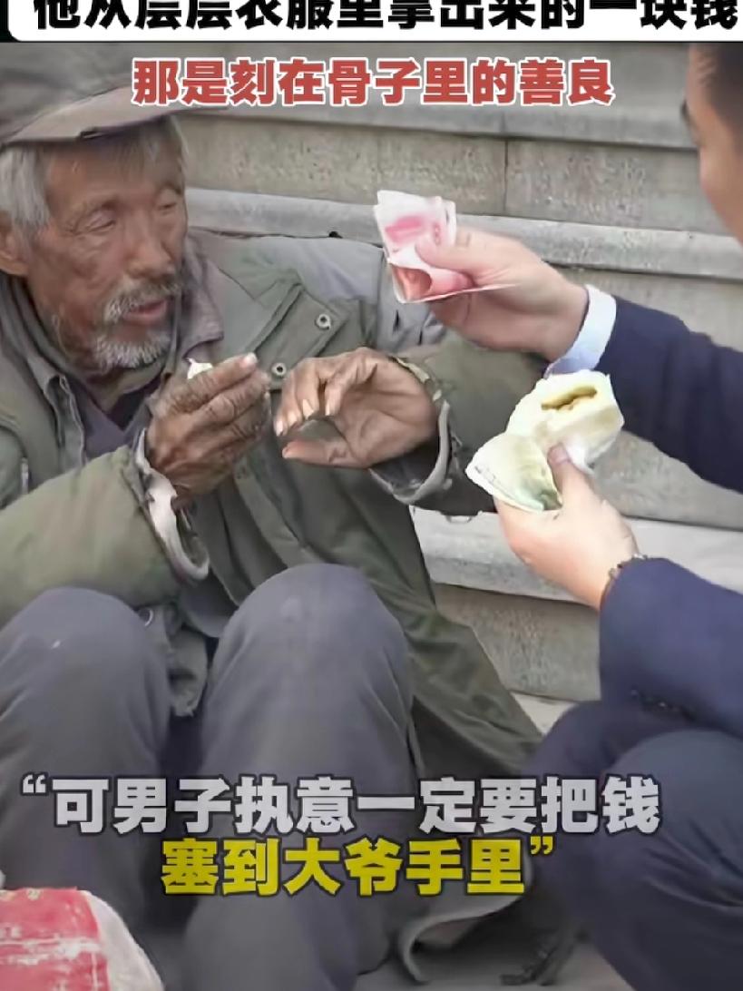男子找路边流浪汉借一块钱坐车,大爷来不及咽下嘴里那口包子,用那双颤抖的双手伸进破烂不堪的口袋里,掏出了一块钱递给了男子,他即惊讶又沉重的接过一块钱,此刻,男子深受感动,钱虽少可刻在骨子里的那份善良无法用金钱衡量! 这时男子坐到大爷的身边,伸手将几张百元钞票递给大爷,大爷再三推脱拒绝,最后男子硬塞进了大爷手里,大爷接过钱瞬间崩溃大哭,也许他好久没有感受人间的大爱,这种被人关心的感觉好似父母的温暖重新再现,双方奔赴的善良感动的不是一个人,而是感动了整个社会!