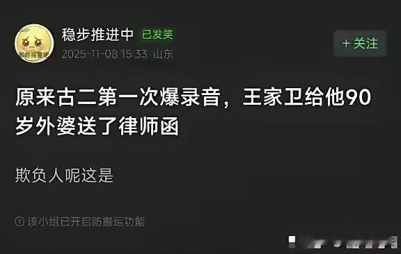 如果王导第一次联系古二外婆,是送治疗捐助,应该没有第二次爆料了吧,可王导给古二外婆送的是律师函。靠可惜啊,人傲慢久了,就再也低不下头了;人养尊处优久了,就再也体会不到身处绝境中的感受了。既然如此,古二只能鱼死网破了。 编剧古二 古二外婆 王二老 梁二老鹅