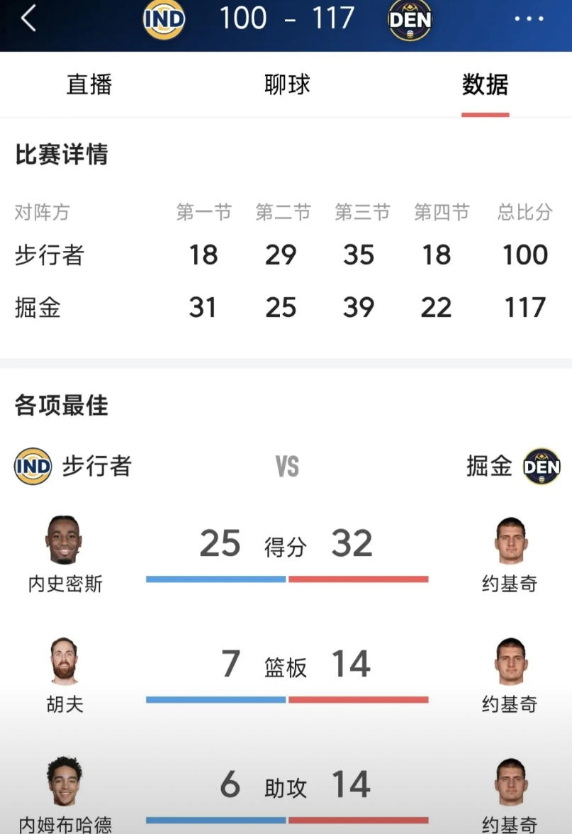 今天掘金主场117比100步行者,约基奇拿到32分14篮板14助攻,只要保持健康,本赛季的助攻王大概率是他,篮板王也有机会,就是得分能不能拿到30+。