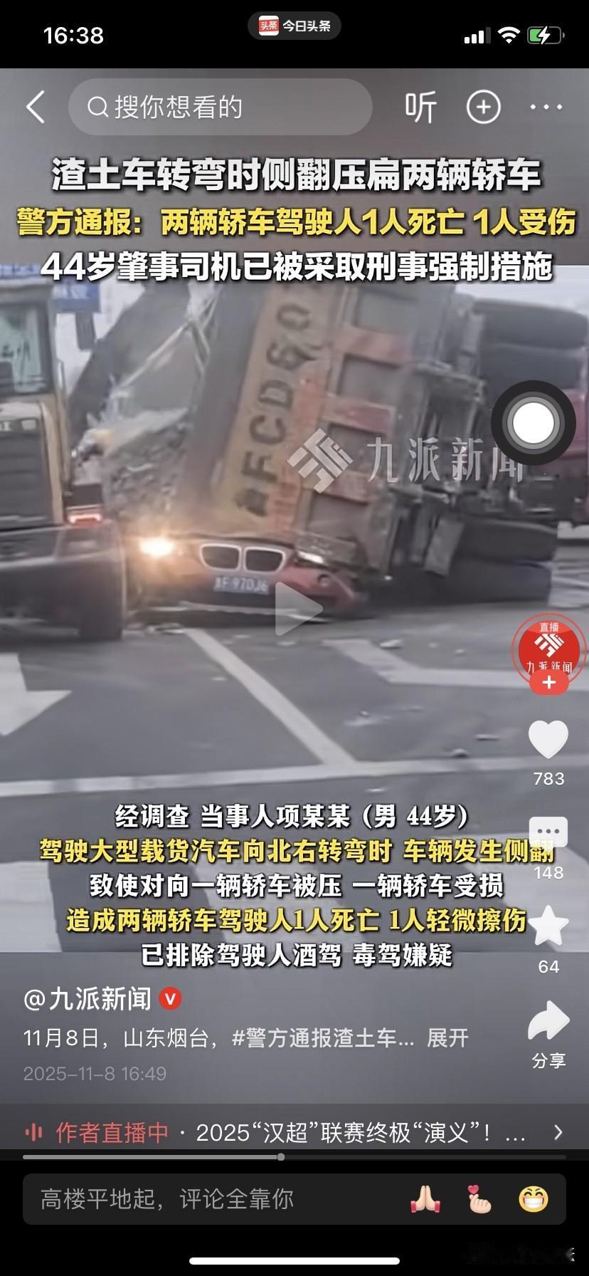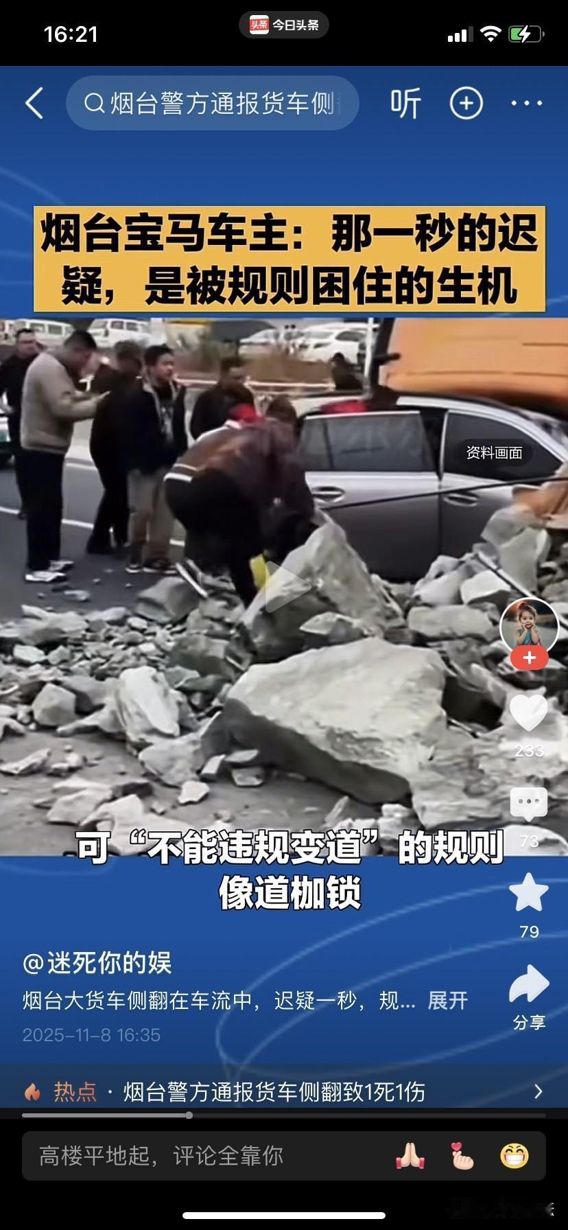 不要让规则把生命困住,山东烟台两辆小车被大货车压扁。 2025年11月7日18:00许,在山东烟台,一辆渣土车在拐弯处不慎侧翻,两辆小车被压扁,造成了一死一伤的惨剧。 画面显示,两辆小车正在等红灯闪过,这是一辆渣土车在拐弯处发生侧翻,红色宝马司机已经察觉到了危险,他来回看了好几次,车子向前动了一下,但是前边有一辆车右边也有一辆车,她不敢随意变道怕违反交通规则,这时,大货车侧翻瞬间把两辆小轿车压扁了,事故造成了一死一的惨剧。 设想一下,如果宝马车司机能加大油门往前冲两三米或许就能保住自己的性命,可能当时他害怕变道超车会扣分或者处罚,没想到遵守规则让自己丢了的性命。 平时,每个人都应该遵守交通规则,但在生命面前,应该随机应变,生命高于一切,不要被规则困住。