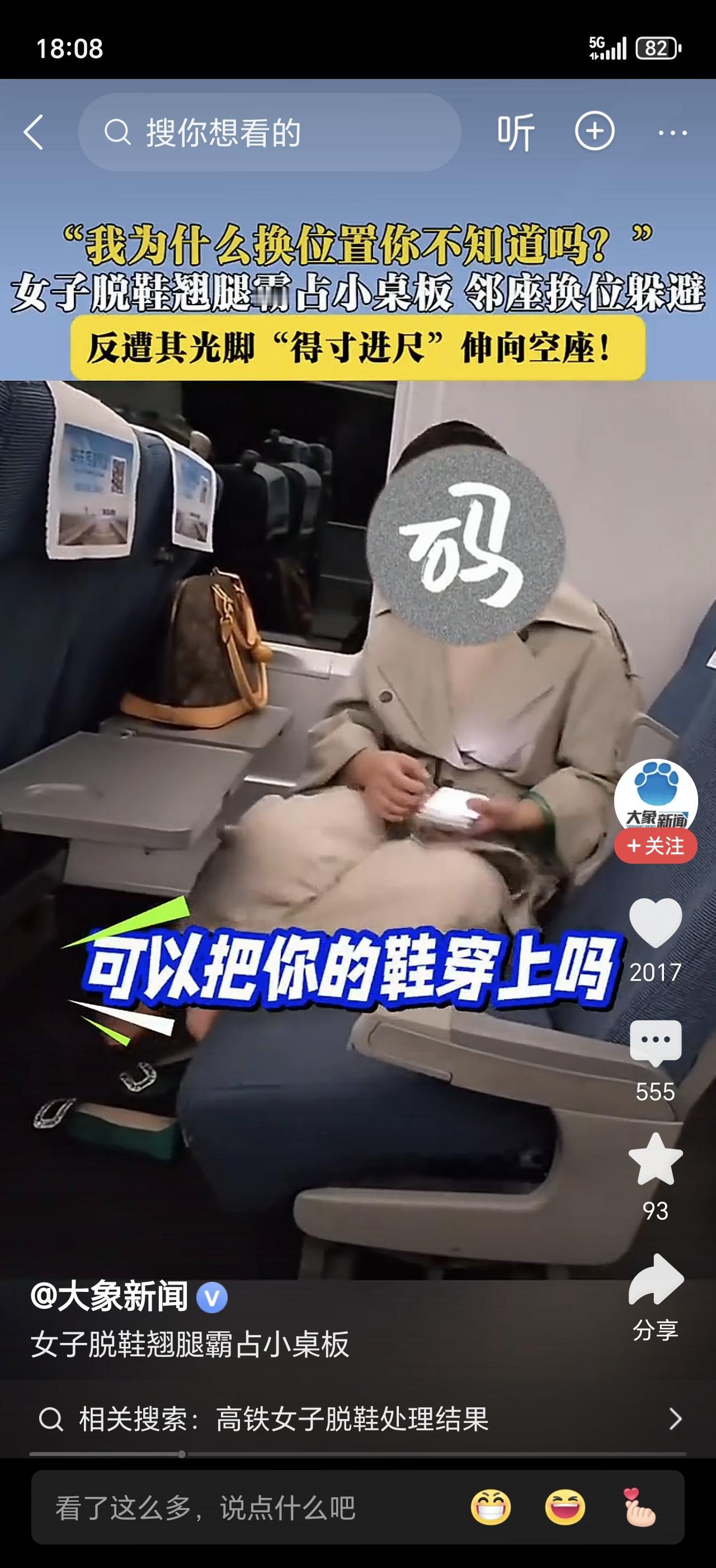 高铁上遇到这种操作,真的能膈应一路!女子脱鞋翘腿霸占小桌板,旁若无人的样子也太没边界感了吧? 邻座大哥想放保温杯,被她直接摆手拒绝:“我脚放这儿呢,你往别处挪挪。” 脱下来的鞋味飘得老远,她还惬意地刷着视频,完全无视周围人皱眉捂鼻子的动作。 小桌板是公共设施,不是私人专属,凭啥她图舒服就霸占着,还污染公共空间?出门在外,互相体谅是基本素养,只顾自己不顾别人的样子真的难看。 后来乘务员过来提醒,她才不情不愿把脚收回,嘴里还嘟囔着“小题大做”。公共场合的体面,从来都是双向的,没素质的行为真的太败好感! 高铁座位 高铁脱鞋女