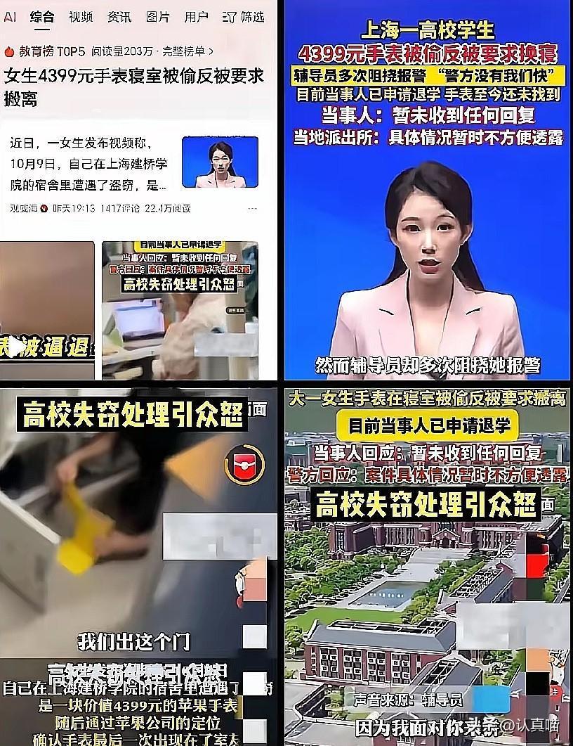 上海建桥学院的这位辅导员, 这会儿估计肠子都悔青了吧! 学生都退学了,还被扒出当初那堆操作,社死程度直接拉满。 新生手表被盗,找他求助,结果倒好——不让报警、不让查监控,随便找个由头,把受害者逼出宿舍。 辅导员的存在,本该是学生的靠山,不是“一言堂”的掌权者。 你们觉得,遇到这种事,学生除了退学,还有更稳妥的解决办法吗?