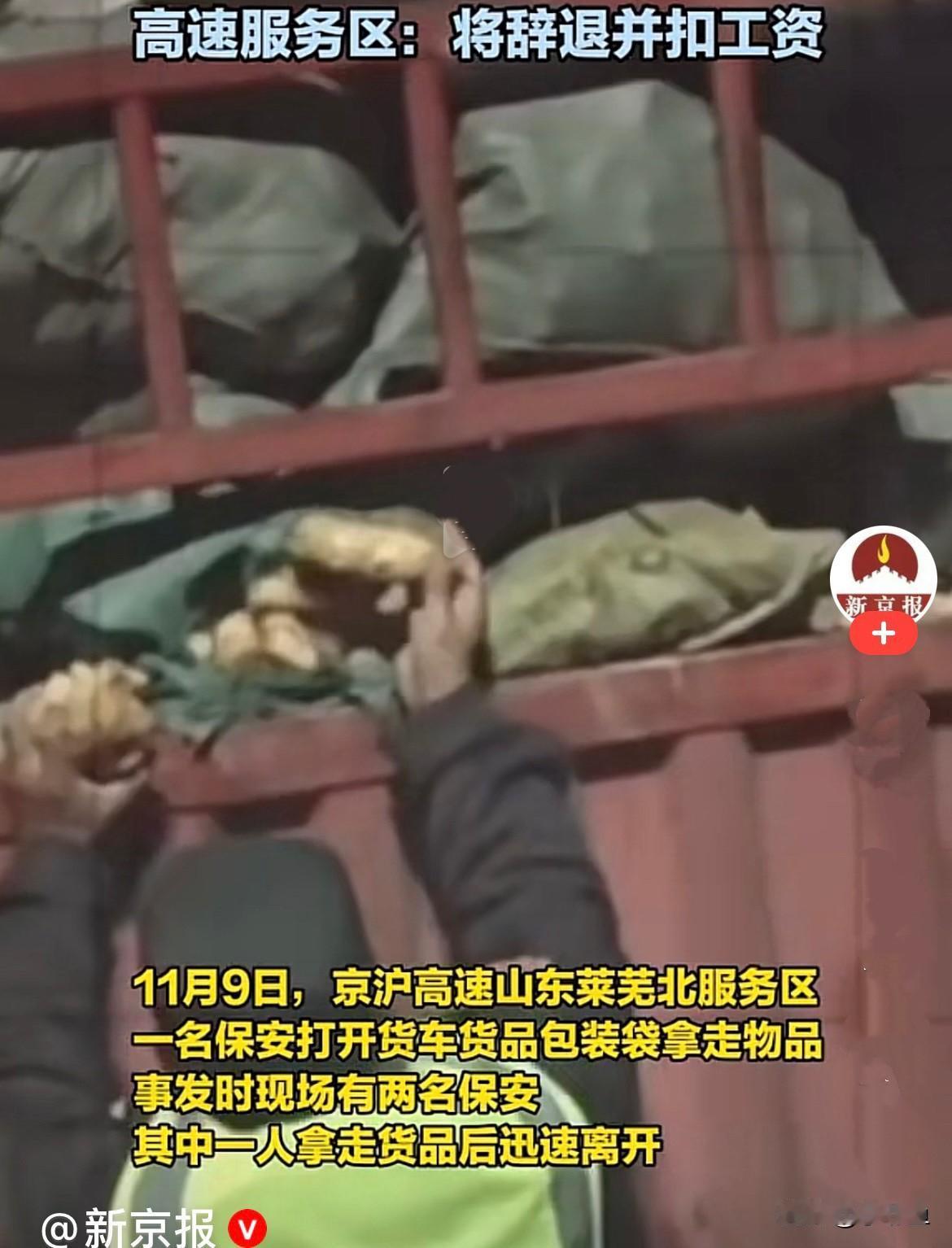 这是什么保安?还偷东西 11月9日,一辆货车停在了京沪高速山东菜芜北服务区,货车里是一个个大的包装袋,袋里装的是生姜…… 一名保安打开了一个包装袋往外拿生姜…… 不知道这是偷窃行为吗?哪怕向司机要,都能给你几块,因小失大,工作没了…… 这是习惯了,见啥偷啥,雁过拔毛,监守自盗…… 行为太恶劣了,把袋子弄开口了,路上掉下来还有不可预见的的危险,必须严惩…… 勿以善小而不为 勿以恶小而为之
