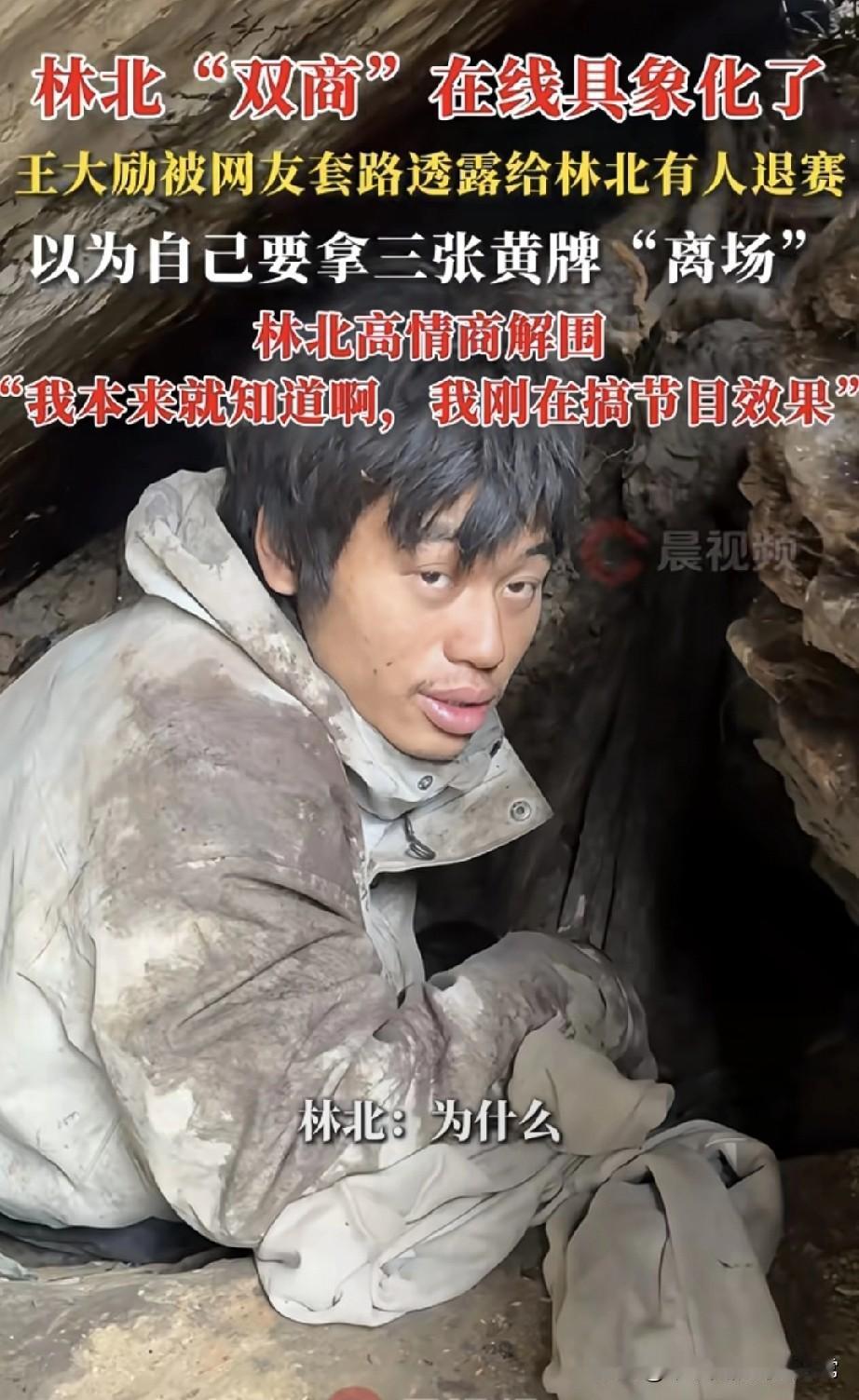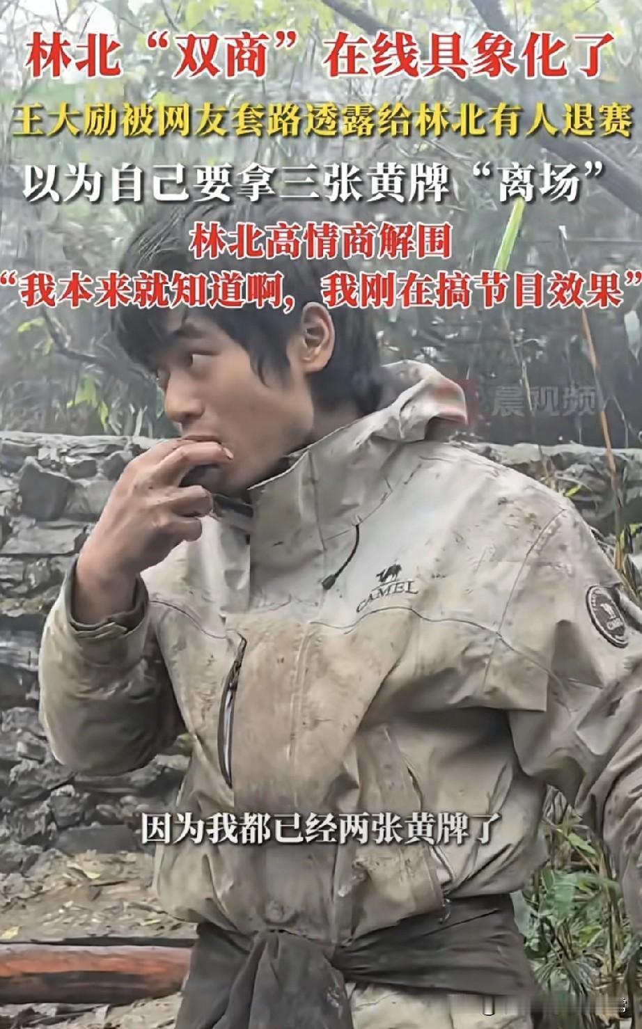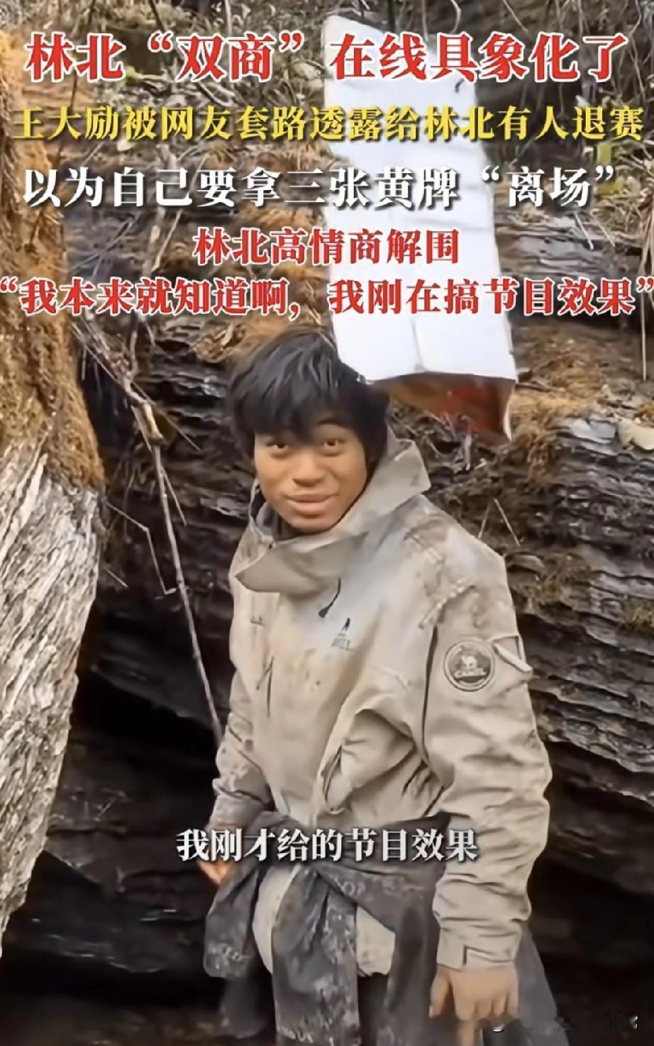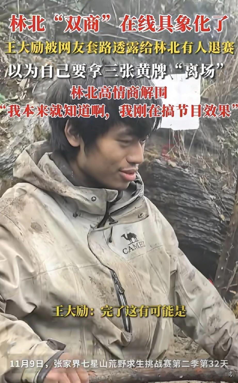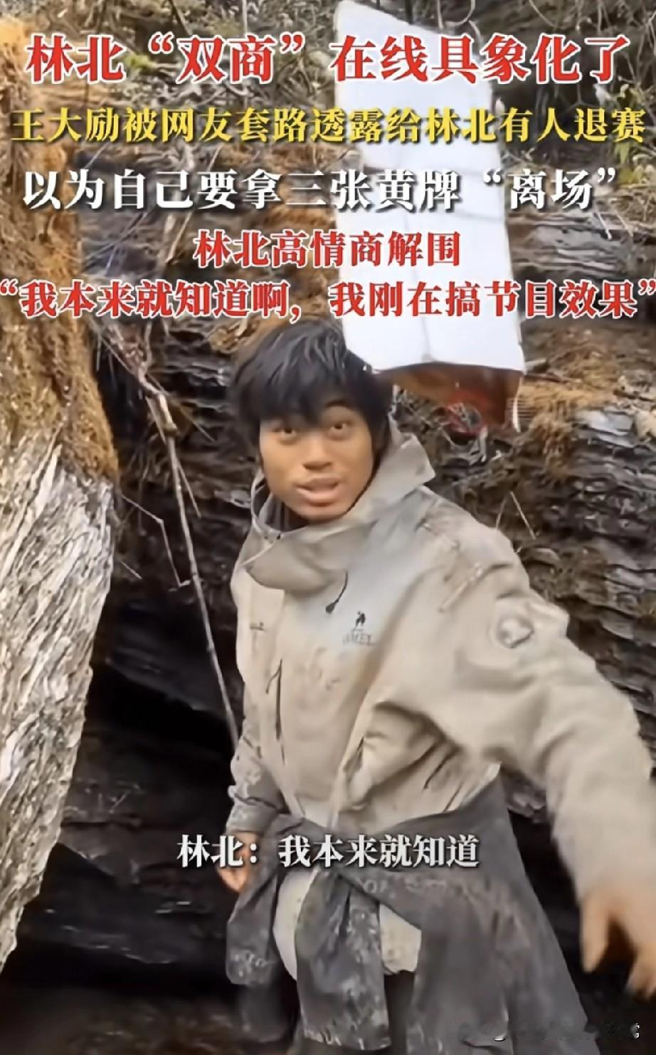 荒野求生王大勋差点“领黄牌”,林北一句话把尴尬裹成节目效果 谁看了这波操作不喊一句“双商天花板”? 荒野求生里王大勋被网友套路,嘴快把“有人退赛”的消息漏给林北,转头就慌了——自己已经两张黄牌,这波怕是要直接“离场”。结果林北裹着满是泥污的冲锋衣,慢悠悠甩了句:“我本来就知道啊,刚在搞节目效果。” 一句话把王大勋的冷汗给按回去了,连弹幕都炸:“这反应速度,是把情商刻在骨子里了吧?” 但我越看越琢磨:林北是真知道退赛消息,还是临时救场圆的谎?毕竟荒野里的“节目效果”,到底是提前演的,还是高情商硬撑的?你们觉得这波是真聪明,还是装糊涂?