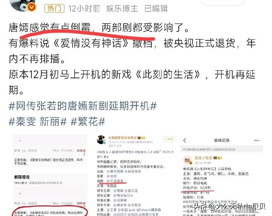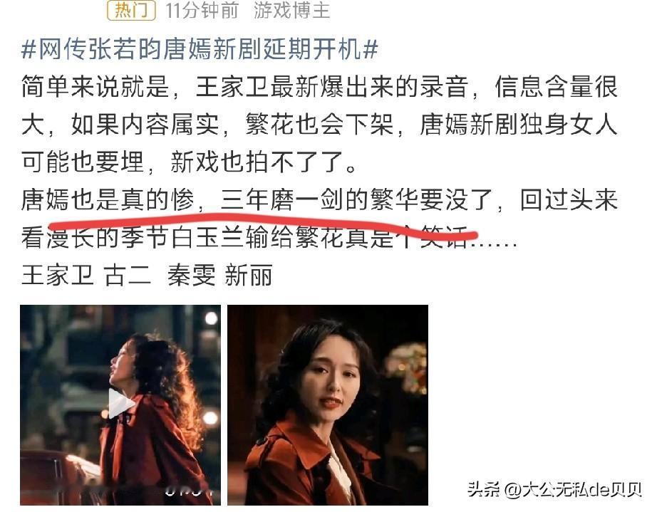 唐嫣先把白玉兰提名视后🏆,以及金熊猫视后奖杯退回去,再来营销自己惨的人设吧。 当初因为和沪⭕️走得近,因为秦雯是她师姐的原因,拿到了繁花的三番女主。 剧播出时,因为演技被夸比之前有进步,各种营销,大男主剧的女二硬生生整出了大女主的气势。 马伊琍这个女一都成了炮灰。 另外,团队一直营销的三年磨一剑也是有点好笑,要是有好剧本,我相信唐嫣早就进组了。 很明显是当时的唐嫣在85🌸掉队太严重,一直找不到合适的项目,才只能把希望劝寄托在繁花罢了。 你看她好姐妹刘亦菲,已经两年多没进组了,也是在磨练演技吗? [捂脸]