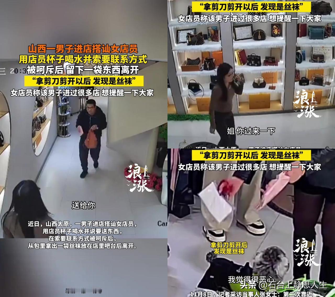 服务行业的姐妹注意!山西这姑娘遇到的搭讪,比被要微信恶心10倍! 太原张女士说,那男的第二次凑过来要加微信,直接拿起她的私人杯子就喝! 她喊隔壁姐姐呵斥,男的立马跑了,还留了个袋子在吧台。 剪开一看,居然是丝袜!我的天,私人杯子就算了,留这玩意儿更膈应! 做过服务的都懂,遇到这种越界的,最怕得罪人但更怕他有下一步,心里慌得要命! 张女士提醒得对!这种变态别忍!喊人、报警,赶紧告诉同行! 你们遇过这种凑得特别近的奇怪顾客吗?当时是喊人还是直接骂? 大家聊聊,给姐妹提个醒!