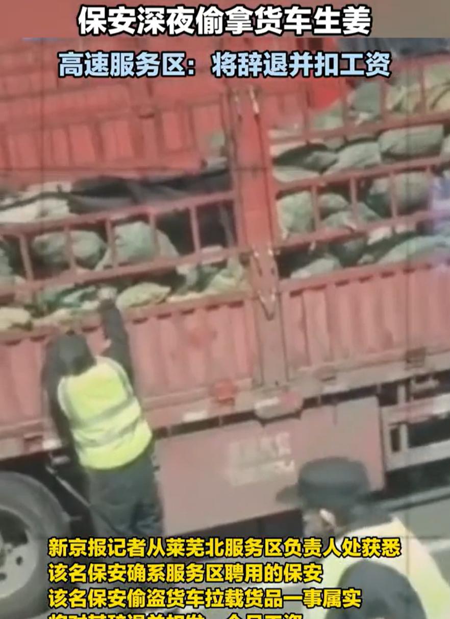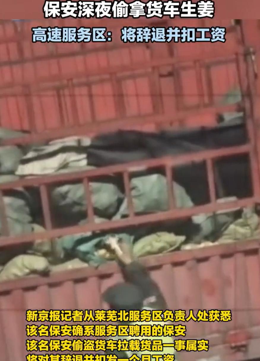 山东有个开大货车的,在莱芜服务区停下车休息。半夜想上厕所,看见两个穿保安制服的人在自己车边转悠。司机悄悄拿手机拍下来,结果发现俩人正往怀里塞生姜,拆开袋子偷了两三块就跑了。 视频发网上后,服务区承认他们是保安,马上辞退还扣了工资。有司机说这点生姜值不了几个钱,但大家担心他们以后敢偷更多。 其实货车司机在路上,服务区算是临时落脚点。东西被动过,心里总觉得不踏实。这事暴露了服务区管理漏洞,保安本来该保护安全,现在反倒成安全隐患。