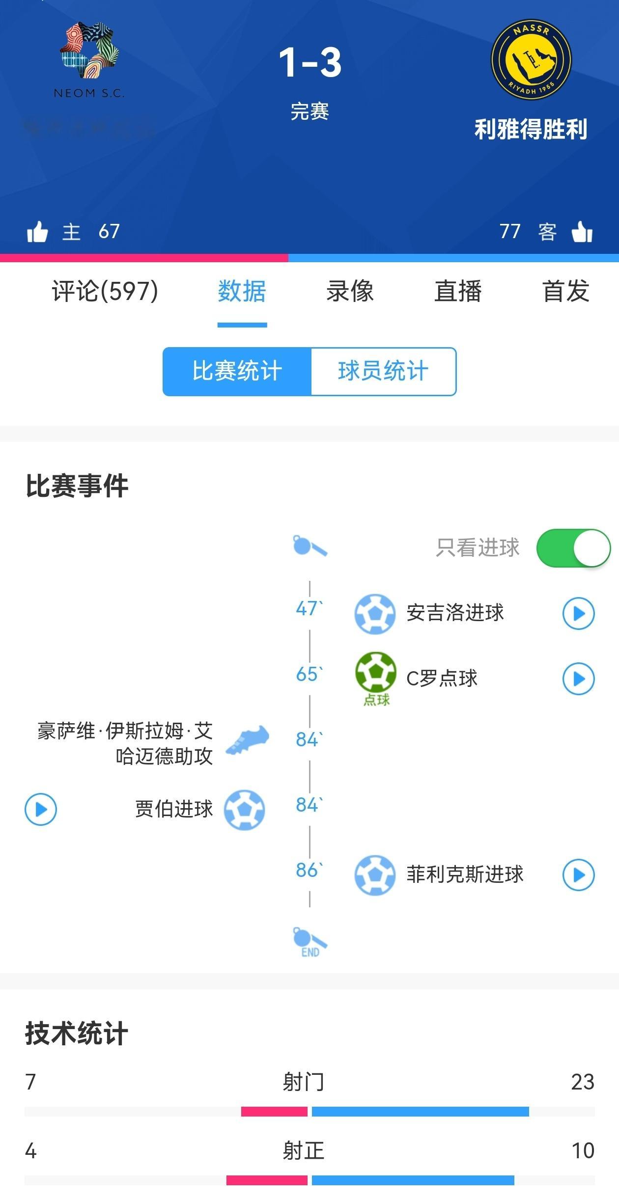 💥利雅得胜利3:1新未来体育城,利雅得胜利全场23次射门罗哥独占8次,但仅靠点球打入一球,依然是除门将外首发触球次数最少的球员,全场尿点图!