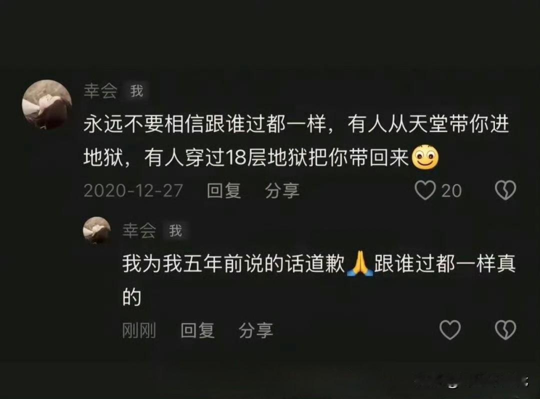 刚要睡觉,被一段话一下又惊醒了! 他说:“永远不要相信跟谁过都一样。有人从天堂带你进地狱,有人穿过18层地狱把你带回来。” 看完我头上如泼来一盆冰水,脑子格外的清醒。 以前觉得婚姻必须是两情相悦青梅竹马,现在觉得能正常沟通就行了。 可是生活那有万般如意,只有经历过了,对比过了就清楚了,生活真不是那样。 好的伴侣会减少人间一半疾苦,能让你温柔的人,肯定是给了你极致的爱!共勉!