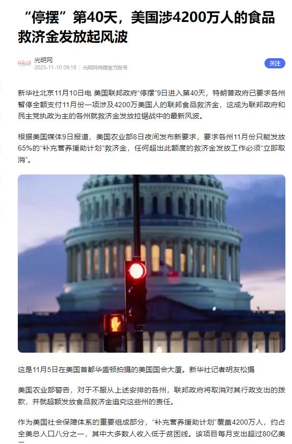 美国传来噩耗 特朗普总统宝座难保 11月9日,特朗普面临退钱也稳不住总统宝座的双重压力。 6日,特朗普当局接到联邦法官裁定的通知,必须全额发放11月的“补充营养援助计划”救济金,即每户按家庭规模和收入情况发放300到600美元不等的救济金。 这计划可不是小打小闹的福利项目,足足覆盖 4200 万美国人,算下来正好是全美总人口的八分之一,每月光支出就超过 80 亿美元,特朗普想从这里抠钱填别的窟窿,简直是在搬石头砸自己的脚。 更让他头疼的是,这可是 SNAP 计划 1964 年设立以来头一遭停发救济金,以往就算联邦政府闹 “停摆”,穷人的吃饭钱也没断过,这次算是彻底打破了 “底线”。 要知道这些受益者里藏着不少关键票仓,光是拉丁裔就占了 1000 万,加利福尼亚、得克萨斯、佛罗里达这三个选举重镇更是受益人大本营,62% 的家庭都有孩子要养,这些人要是饿了肚子,选票可不会跟着感情走。 休斯敦的食物银行早就排起了半英里长的车队,42.5 万户家庭挤在那儿领救济,有个叫詹尼斯的联邦雇员说得直白:“感觉政府根本不在乎我们”,这话要是传到摇摆选民耳朵里,特朗普的支持率怕是又要跌一截。 特朗普一门心思想省这笔钱,根源还是他自己挖的财政窟窿。 当年搞《减税与就业法案》,给企业和富人送了 1.5 万亿美元的大礼包,企业税从 35% 砍到 21%,富人个税也降了,遗产税干脆快取消了,钱出去了自然要从别处找补,于是就盯上了穷人的福利。 之前的 “大而美” 法案已经砍掉了 SNAP 近 3000 亿资金,还把领取资格卡得更严,硬是要把 64 岁以下的人都逼去工作,连退伍军人和无家可归者都没放过,这下好了,想干脆停发一个月,直接捅了马蜂窝。 法官裁定后特朗普的操作更是把 “被动” 写在了脸上,6 号刚接到裁定,7 号就急匆匆上诉到联邦上诉法院,被驳回后又连夜捅到最高法院,好不容易拿到个临时中止令,可这顶多是缓兵之计,根本解决不了问题。 要知道这 80 亿美元可不是笔小数目,美国农业部光 11 月 7 号当天就得准备 40 亿,而他减税造成的财政赤字早就窟窿巨大,现在要么硬着头皮掏钱得罪自己的金主,要么顶着法律风险不发钱得罪 4200 万选民,怎么选都是错。 更要命的是这事已经引发了连锁反应,密歇根大学的消费者信心指数直接跌到 50.3,创下三年来最低,白宫经济顾问都承认第四季度 GDP 要受拖累,旅游行业先遭了殃。 航空领域更是乱成一锅粥,1.3 万名空管员无薪上班,40 个机场要削减 10% 航班,纽瓦克机场的航班延误超 5 小时,这锅全得扣在特朗普头上。 民主党早就抓住把柄猛攻,说他 2019 年创过最长停摆纪录,现在又来折腾老百姓,共和党内部也有不少人慌了,毕竟得州、佛州的选民要是闹起来,自家席位也保不住。 SNAP 停发这事儿最讽刺的地方在于,美国明明有 5300 万人本来就吃不饱饭,特朗普却忙着给富人减税,现在被法官逼着退钱,既丢了里子又没了面子。 那些依赖救济金的家庭里,有得州军事基地的护士丽莎,停发后连房租都交不起,房东还不肯通融;还有无数带孩子的单亲妈妈,300 美元可能就是整个月的奶粉钱。 这些人的怨气可不是一张临时中止令能压下去的,尤其是拉丁裔选民,本来对特朗普的移民政策就不满,现在连吃饭钱都要抢,下次投票怕是要用脚表态。 特朗普这会儿怕是悔得肠子都青了,想省点钱却把自己架在了火上烤。 发钱吧,财政赤字扛不住,金主爸爸要翻脸;不发吧,法律不答应,选民要造反,毕竟 4200 万人占了总人口八分之一,真要是联合起来反对,总统宝座就算有金山银山也稳不住。 这哪是省开支,分明是给自己的选举之路挖了个大坑,还是那种填上要花钱、不填要掉下去的两难坑。