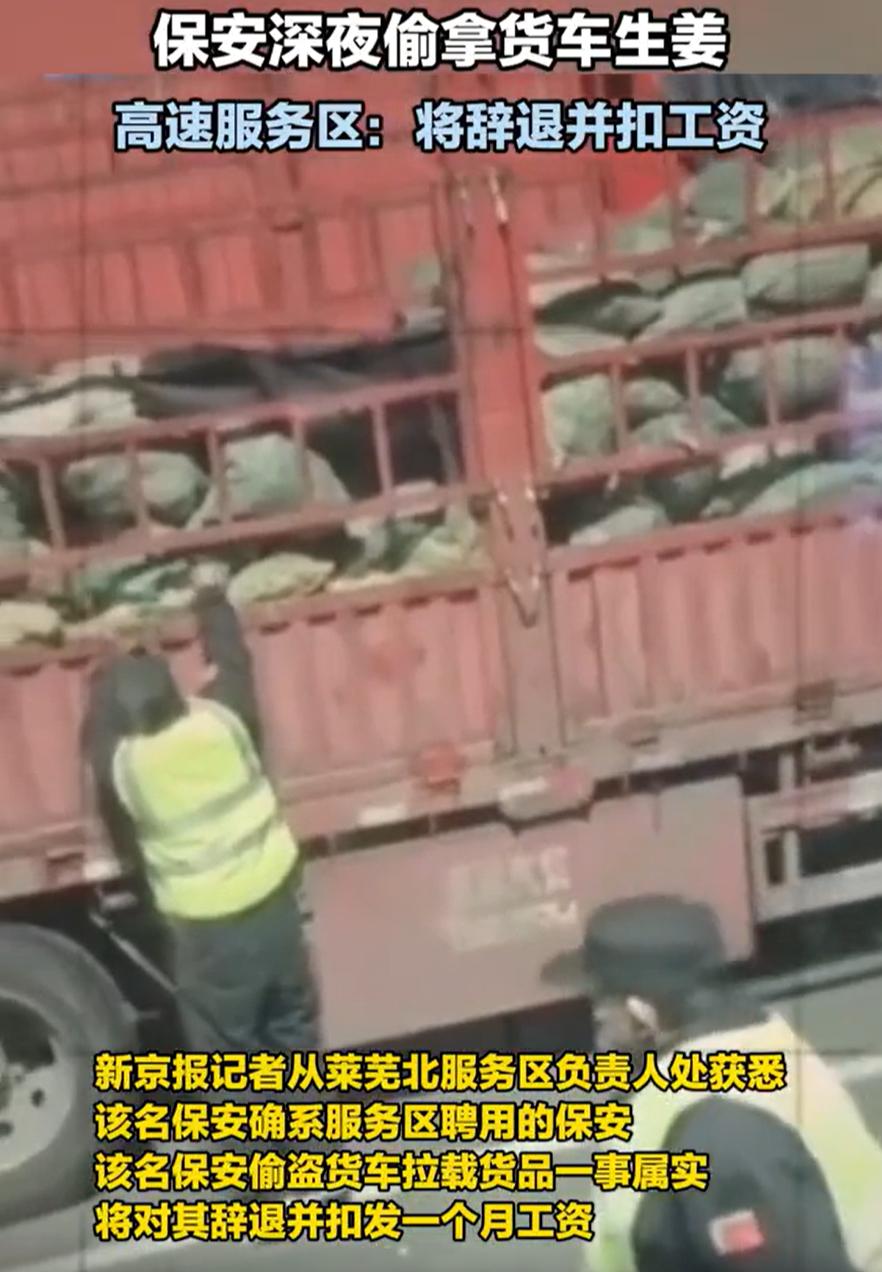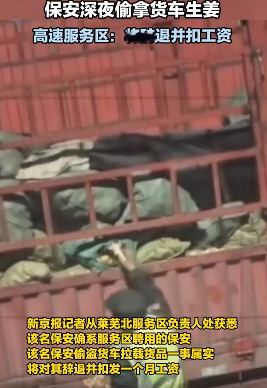山东莱芜,一位大车司机跑高速时把车停在服务区,半夜起夜时,突然看到两名穿着保安衣服的人在车旁边不知道干嘛,司机在旁边用手机偷偷录下来,发现两人竟然在偷拿货车的生姜,虽然拿走的不多,但这种行为却让人很不舒服 据拍摄视频的货车司机回忆,事发当晚他起夜时偶然发现两人在自己的货车旁逗留,察觉异常后便悄悄用手机记录下后续过程。 视频中清晰可见,两名保安分工明确,一人负责在旁观察望风,警惕周围动静,另一人则迅速上前拆开货车上的货物包装,麻利地抓取几块生姜塞进怀里,整个作案过程前后不足两分钟,随后两人便迅速消失在夜色中。 而更令人震惊的是,司机在事后调取监控时发现,这并非两人首次作案,前一天晚上,其中一名保安就已用同样的手法从他的货车上偷走了半袋生姜,当时他还误以为是自己卸货时不慎遗漏。 两次作案手法高度一致,足以说明这并非临时起意的偶然行为。 网友们在看完视频后纷纷提出质疑,从两人直奔货车的明确目标、熟练拆解包装的动作,到精准控制盗取数量以避免引起注意的细节,再到分工明确的默契配合,都透着长期作案形成的固定模式。 更值得警惕的是,作为服务区保安,他们凭借日常巡逻的工作便利,对辖区内货车的类型分布、司机的休息规律以及监控设备的盲区位置了如指掌,这种职务赋予的信息优势,最终却被他们用来实施盗窃行为。 他们特意选择生姜这类体积小、易携带且价值不高的物品作为目标,显然是精心算计后的低风险作案选择,即便被发现,也能找“拿几个尝尝”的借口搪塞。 事件在网络上引发的争议呈现出明显的两极分化。 一部分网友秉持宽容态度,认为只是偷拿了几块生姜,数额不大,或许只是满足个人食用需求,主张“得饶人处且饶人”。 但更多网友对此表示强烈反对,他们担忧这种“小贪”的行为一旦养成习惯,界限感会逐渐模糊,今天敢偷几块生姜,明天就可能对价值更高的货物下手。 服务区对常年奔波的货车司机而言,不仅是歇脚的场所,更像是旅途中临时的家,他们将车辆和货物托付给服务区,本是出于对安保人员的信任,而这种监守自盗的行为,无疑彻底打破了这份信任,性质远比盗取物品的价值本身更为恶劣。 今天的分享到这里就结束了,大家对此事有何看法,欢迎在评论区留言和讨论,感兴趣的可以点击头像加关注,我将每日更新优质内容,我们下期见。