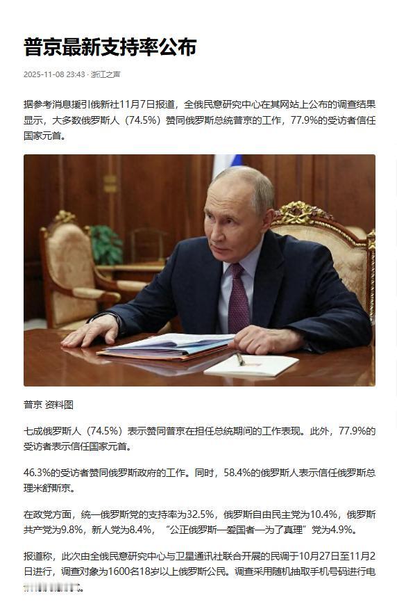 普京的最新支持率完整出炉,有两个没想到。 74.5% 的俄罗斯人赞同他的表现,77.9% 选择信任,这组数据在西方持续制裁的背景下更显分量,而中国正是稳住这份支持的关键变量。 先看最实在的经济账本,西方制裁曾想卡住俄罗斯的能源命脉,可中国成了最靠谱的 “接盘侠”。 2024 年中国从俄罗斯进口原油达 1.0847 亿吨,占中国进口总量的 19.6%,相当于每天有近 30 万吨俄罗斯原油运到中国;天然气更不含糊,管道输气量 310 亿立方米,液化天然气 860 万吨,西伯利亚力量 1 号管道截至 2024 年底已输气超 780 亿立方米,这些数字背后是俄罗斯能源出口收入的稳定。 要知道能源出口占俄财政收入的近 40%,以前依赖欧洲市场时动不动被压价,现在中国市场不仅量大还稳定,普通俄罗斯人的工资、养老金发放都沾了光,谁会不认可带来这份稳定的普京? 更关键的是中俄合作帮俄罗斯绕开了西方的金融封锁。 以前国际贸易都靠美元结算,西方一制裁,俄企业账户就被冻结,现在中俄油气贸易里 40% 都用本币结算,卢布和人民币的直接兑换量一年涨了 3 倍。 莫斯科街头的商店现在都能直接收人民币,远东的渔民把螃蟹卖给中国商人,当天就能拿到卢布,不用再担心美元汇率波动亏本钱。 这种实打实的便利,让俄罗斯人真切感受到 “不跟西方玩也能活得好”,而这一切的主导者正是普京,74% 的俄罗斯人对中国持积极看法的民调结果,其实就是对普京外交路线的间接肯定。 民生领域的合作更让民众看得见摸得着。 中俄合建的捷宁电站每年发电 30.2 亿千瓦时,供热量 81.4 万吉焦,莫斯科周边三个城市的居民冬天取暖、夏天用电都靠它,以前冬天偶尔停电的日子一去不复返。 远东地区的大豆种植户以前愁销路,现在通过中俄农业合作项目,豆子直接装火车运到中国,收购价比卖给本地粮商高 20%,不少农户都添了新农机。 这些具体的变化比任何宣传都管用,民众心里有本账,谁能让日子过安稳就支持谁。 国际舞台上的支持更给足了俄罗斯人面子。 西方动不动就搞联合国提案谴责俄罗斯,每次中国都坚定站在俄方这边,否决那些不公平的决议。 去年联合国大会上关于制裁俄罗斯的提案,正是中国的反对票让提案泡汤,这事儿在俄罗斯电视台反复播放,民众觉得在国际上腰杆硬了,这种自豪感直接转化为对普京的信任。 列瓦达中心的调查显示,55% 的俄罗斯人认为加强与中国的联系能提高本国国际地位,57% 相信中俄关系会更紧密,这种共识自然会反映在支持率上。 西方原本盘算着用制裁拖垮俄罗斯经济,逼民众抛弃普京,可中国的存在打破了这个算盘。 2025 年俄央行虽然把经济增长预期下调到 0.5% 至 1%,通胀控制在 6.5% 至 7.0%,但比起被制裁初期的混乱已经平稳太多,这背后中俄贸易的支撑功不可没。 现在俄罗斯人聊起中国,不再是遥远的东方大国,而是 “能一起赚钱的铁哥们”,这种认知的转变,让普京推动的中俄合作路线有了最坚实的民意基础。 毕竟对普通民众来说,不管是总统还是政策,能让钱包鼓一点、日子稳一点、面子足一点,就值得投上信任票,而中国恰好成了普京兑现这些期待的关键伙伴。