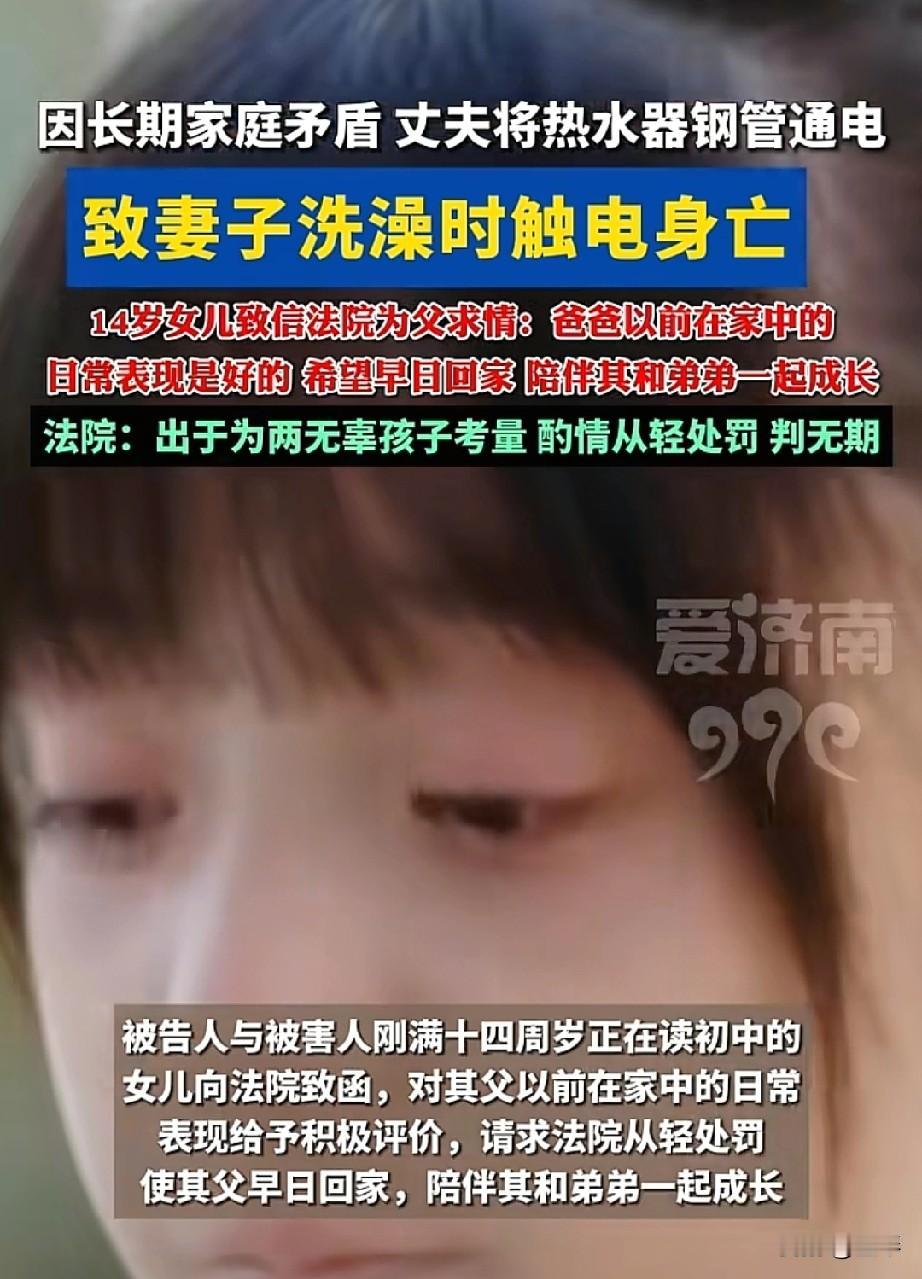 父母长期发生矛盾纠纷,父亲电杀母亲,14岁女儿却为凶手求情,女儿这样做对吗? 当“家庭纠纷”变成致命的凶器,当至亲的双手变成夺走母亲生命的工具——14岁女孩的一纸求情信,让这起故意杀人案,从“恶性犯罪”变成了戳中无数人软肋的情感困局。 裁判文书网最新披露的判决里,杨某因长期家庭矛盾,将热水器钢管通电,致妻子洗澡时触电身亡。证据链清晰的故意杀人,本该是板上钉钉的重刑,可14岁女儿的信,却让法庭的量刑多了一层沉重:“爸爸以前在家很好,希望他早点回来陪我和弟弟长大。” 最终,法院出于两名孩子的抚养考量,酌情从轻判处杨某无期徒刑。 评论区吵翻了:有人骂女孩“是非不分”,有人叹“她只是没了妈妈,不能再失去爸爸”——可14岁的她,真的懂“谅解”意味着什么吗? 她或许记得爸爸周末买的零食,记得弟弟哭时爸爸哄人的模样,却未必能完全消化“爸爸杀死妈妈”的残忍本质。 对这个突然被推到“选边站”路口的孩子来说,“爸爸回家”不是对罪恶的纵容,更像她在家庭崩塌后,能抓住的最后一根“生活稻草”:没了妈妈,若再没爸爸,她和年幼的弟弟,要怎么在这世界站得住脚? 可这份“软肋式的谅解”,恰恰是这起悲剧最刺人的地方:杨某用极端暴力摧毁了家庭,却又借着孩子的依赖,成了“从轻处罚”的理由;而失去母亲的女孩,还要用“爸爸很好”的自我说服,来拼凑破碎的生活。 法律的天平偏向了孩子的抚养需求,可情感的天平上,那个永远不会再回来的母亲,又该被谁记得? 这场“谅解”从来不是“是非模糊”,是一个孩子在绝境里,被迫做出的、带着血泪的生存选择。 你问我答家长里短