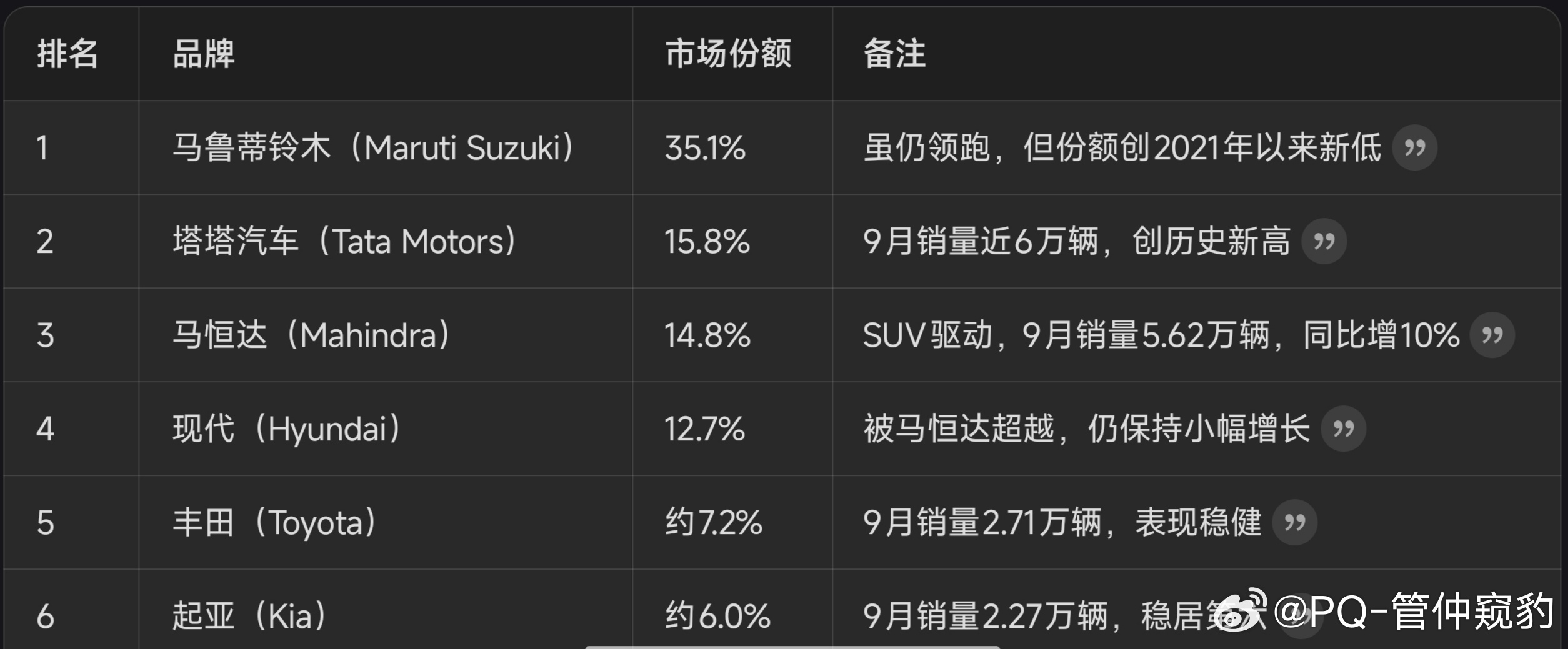 印度销量最好的品牌是铃木(日本)和塔塔(印度本地企业,捷豹路虎的母公司)