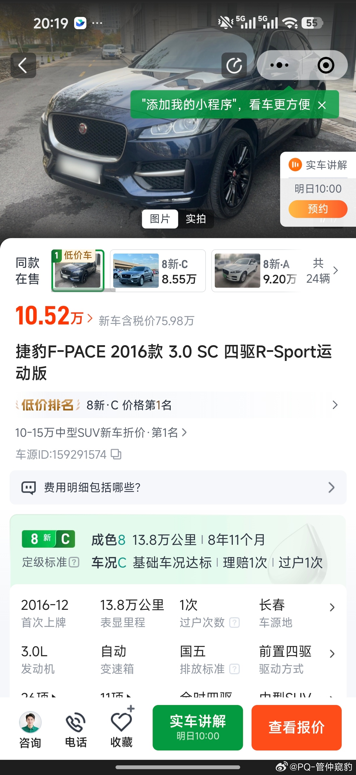 曾几何时我觉得捷豹的SUV很帅,很想拥有,当时价格太高,我记得高性能版售价接近百万,现在看看二手车,当年百万,现在竟然10w
