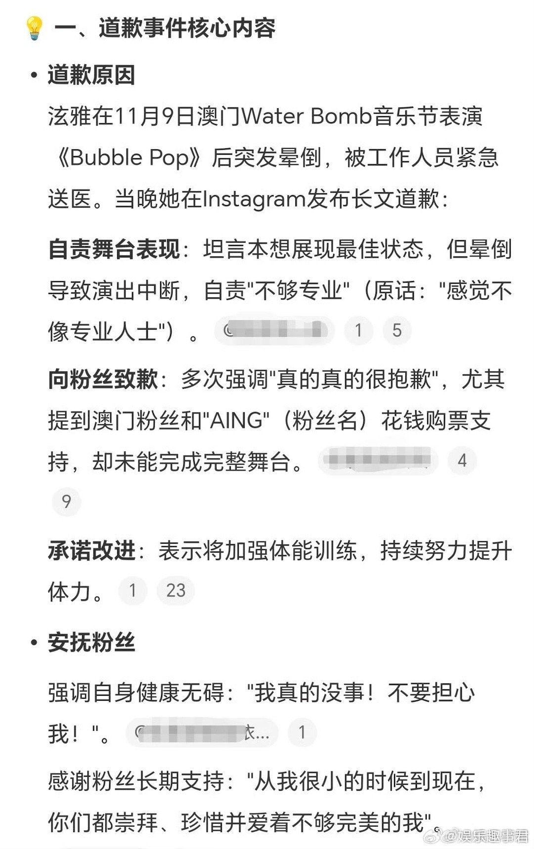 泫雅道歉泫雅在澳门"Water Bomb音乐节"表演代表作《Bubble Pop》后突然失去意识倒地,被工作人员紧急抱离送医。现场目击者称她在演出中已显露疲态,但仍坚持完成表演。之后,泫雅坦言因晕倒导致演出中断,自认"不够专业",并多次强调"真的真的很抱歉","今后会更努力锻炼体力,持续提升耐力"。