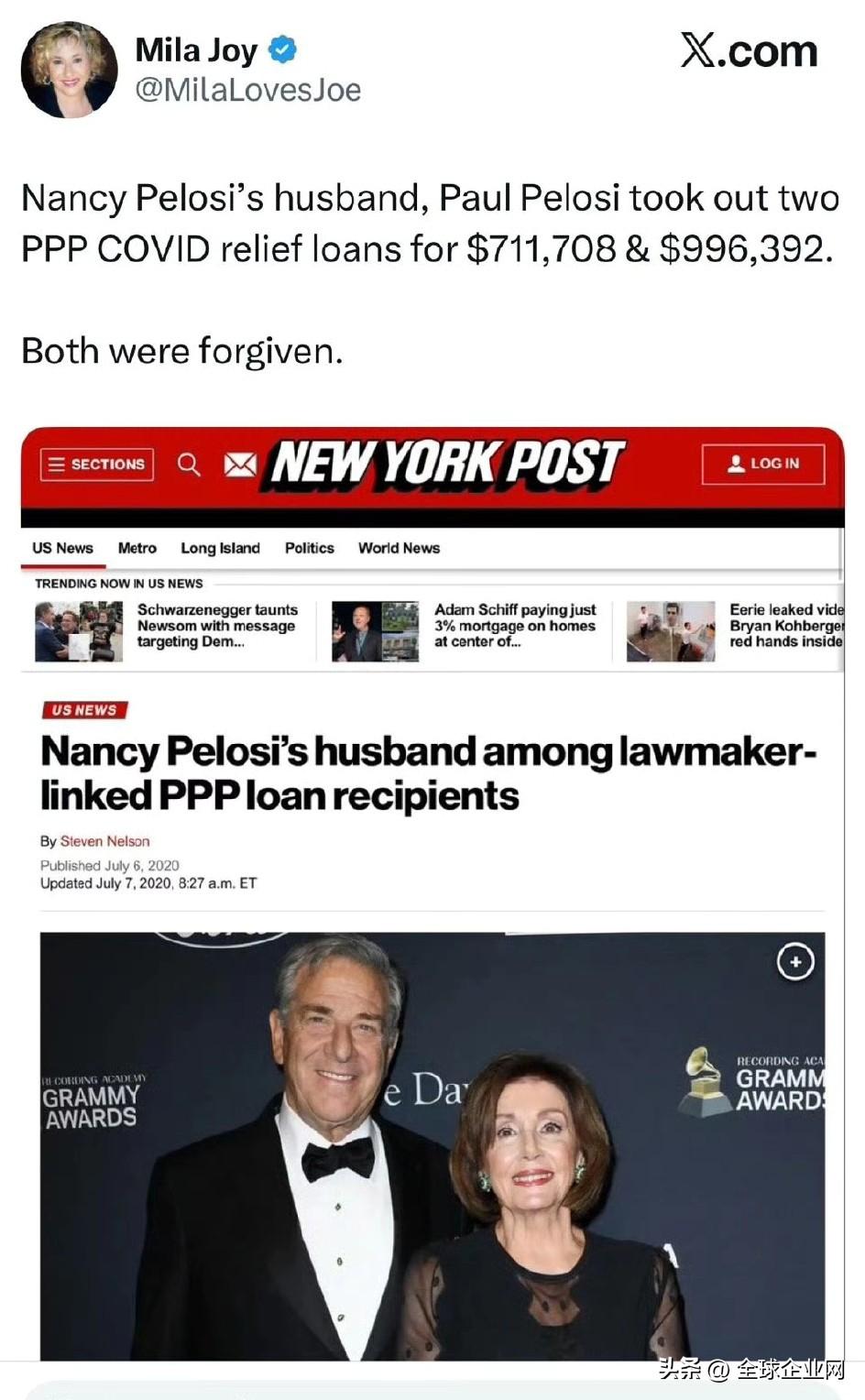 南希·佩洛西的丈夫保罗·佩洛西获得了两笔PPP新冠肺炎救济贷款,金额为711,708美元和996,392美元。 两者都是不用歸還的。 《纽约邮报》的一项调查显示,南希·佩洛西将30年的股票交易转化为1.33亿美元,实现了惊人的17,000%的回报,比道琼斯指数高出十倍。