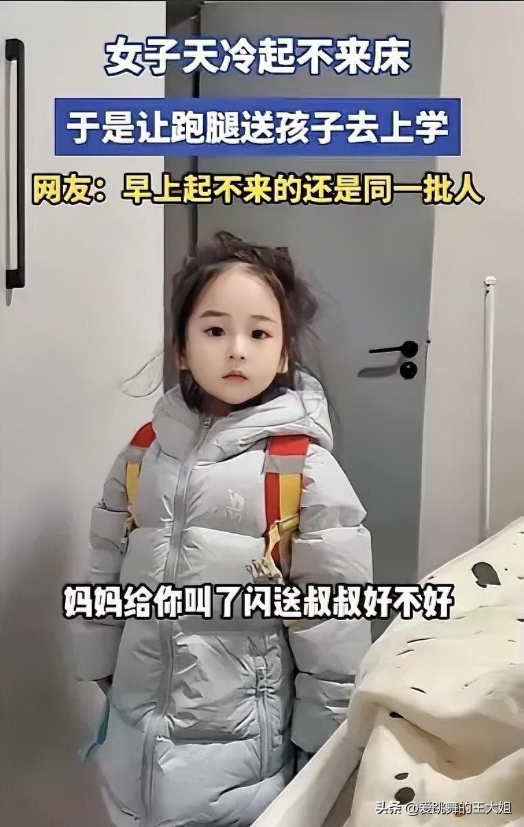 “万万没想到!”天津,一幼儿园萌娃收拾好准备去上学,发现妈妈还躺在被窝,就问妈妈谁送她去上学,没想到妈妈却说天太冷不想去,叫了个跑腿小哥。 跑腿小哥小王接到订单时愣了好几秒,反复确认收货地址是某小区某栋楼,送货内容栏赫然写着“送一名五岁女童到XX幼儿园”。他提着早餐赶到小区门口,看见个穿粉色羽绒服的小姑娘独自站着,书包都快比人大了。妈妈从窗户探出头喊:“师傅,孩子交给你了,车牌我记下了啊!”这一嗓子引得邻居纷纷张望,小王尴尬得直挠头,给孩子系安全带时手都在抖,一路开车慢得像考驾照。 这事儿被小区邻居拍下来发到网上,瞬间炸开锅。有网友直言每个月靠闪送接单送孩子五六回,差点成了固定订单。年轻群体里冒出不少共鸣声,调侃“冬天起床痛苦指数堪比早高峰堵车”。可幼儿园老师林洁看到视频却皱紧眉头,她发现小姑娘到教室时头发乱蓬蓬的,牛奶也没带,明显是匆忙出门的模样。 这种新型“偷懒式育儿”背后藏着更深层的教育隐患。当父母把接送孩子这类日常互动都外包给陌生人,无形中切断了亲子间珍贵的日常连接机会。那些上学路上的牵手叮咛、放学时的见闻分享,恰恰是家庭教育最自然的场景。有研究表明,幼儿期最依赖的正是这些生活细节里的陪伴质量。 不过换个角度想,为什么年轻妈妈宁愿花12块找跑腿也不愿起床?现代父母承受的压力确实需要被看见。不少家庭面临双职工带娃的艰辛,凌晨加班凌晨赶项目是常态。但解决之道不该是压缩亲子互动时间,而需要更合理的家庭分工。就像有些家庭会让爸爸参与晨间流程,或者前一晚准备好衣物早餐,把早晨从战争变成游戏。 更值得警惕的是这种服务化思维对亲子关系的侵蚀。如果连基本照料都能打包外卖,会不会有一天睡前故事也变成付费音频?家庭教育从来不是可以“下单代劳”的事务,它藏在每天重复的陪伴里。那些孩子赖床时妈妈温柔的坚持,匆忙中亲手扎的小辫,反而是成长中最有温度的教材。 这件事最该引发的不是对妈妈的口诛笔伐,而是我们对当代育儿困境的集体反思。当城市节奏快得让人喘不过气,更需要社会支持系统来托举家庭——比如企业推行弹性上班制,社区组织互助接送群。毕竟孩子的成长没有重播键,有些路注定要陪着慢慢走。 各位读者你们怎么看?欢迎在评论区讨论。