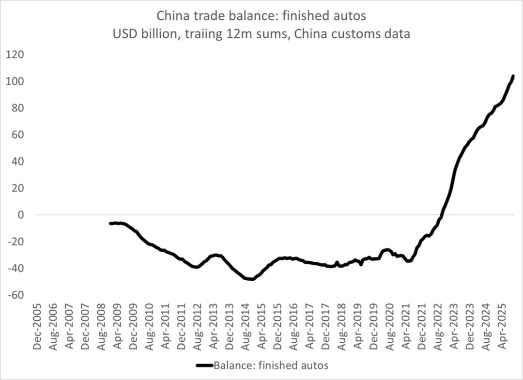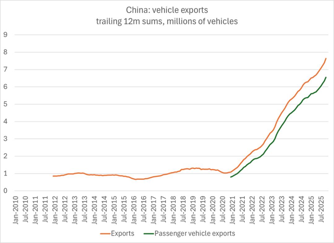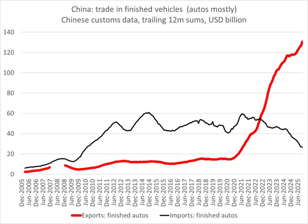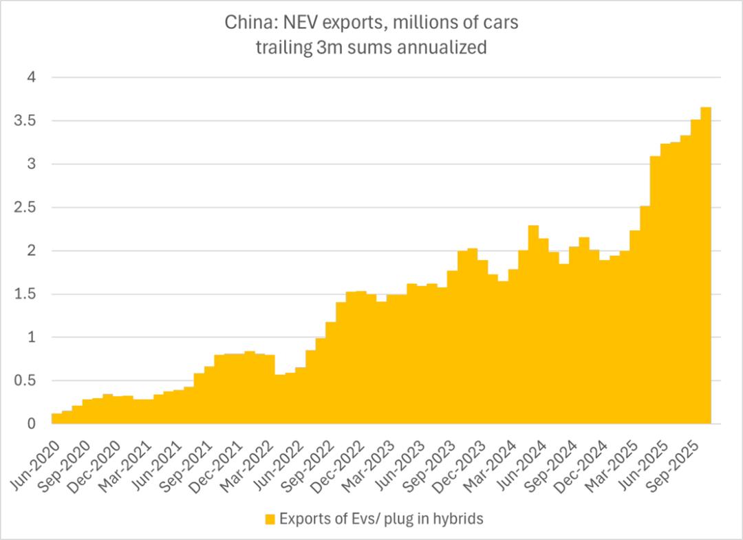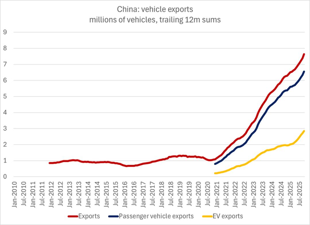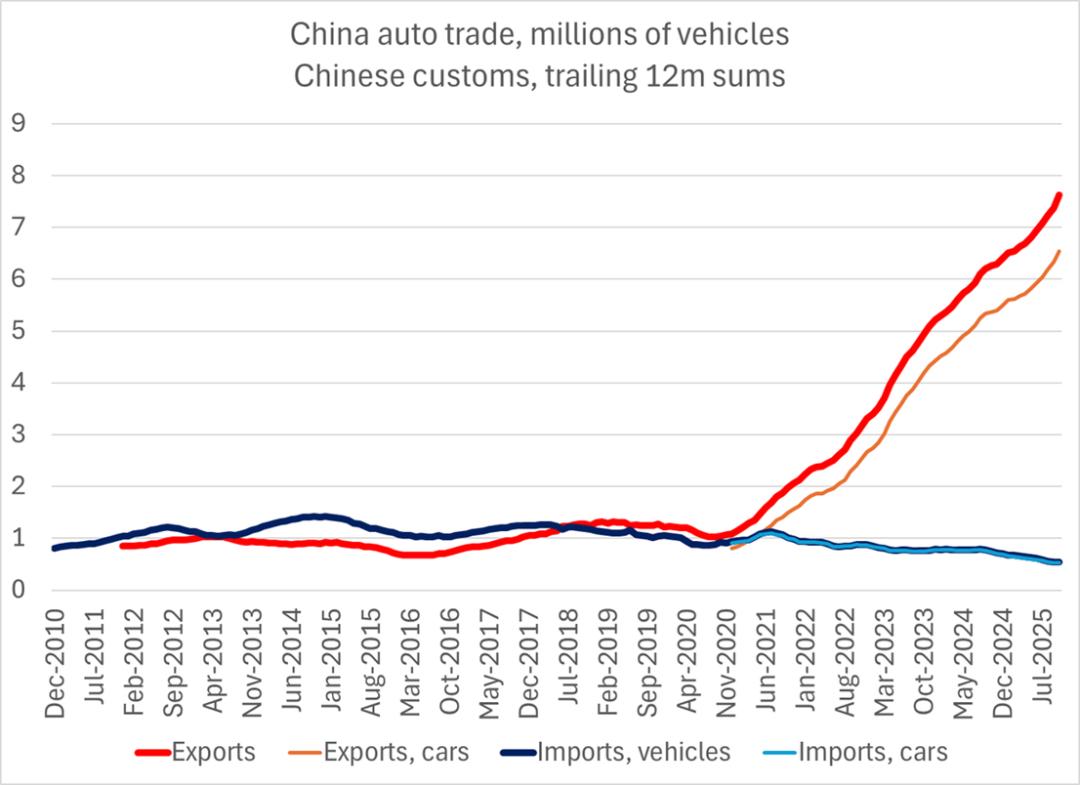 美国外交关系协会资深研究员Brad Setser发帖称,今年10月,中国汽车出口继续增长,达82.5万辆,全年出口量将接近1000万辆;10月小客车出口量超过70万辆,全年出口量有望达到850万辆。 尽管中国的整体出口增速在10月有所放缓,但汽车出口表现出乎意料地强劲。此前2024年的预测认为中国的出口势头将逐渐消退,但事实并非如此——出口增速实际上再次加快。目前,汽车贸易顺差已超过1000亿美元。 不仅汽车出口数量在加速增长,出口额(以美元计)也在加速增长。与此同时,进口汽车正在逐渐被排挤出中国市场。目前,汽车进口量占中国国内销量的比例已下降到2%以下) 2025年中国汽车出口增长在很大程度上是由电动汽车和新能源汽车(包括插电式混合动力汽车)推动的。 从趋势来看,中国的新能源汽车出口似乎正朝着每年400万辆的水平迈进——这是一个相当可观的数字。相比之下,特斯拉全球产量不足200万辆,其中约有100万辆是在中国生产的)。 Brad Setser认为,过去五年汽车贸易格局的变化之大令人震惊,而且这场变化还远未结束。 图片来源于网络