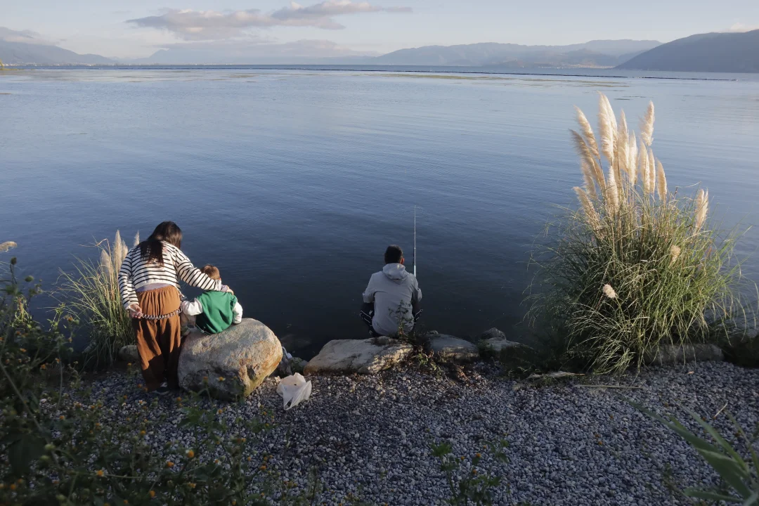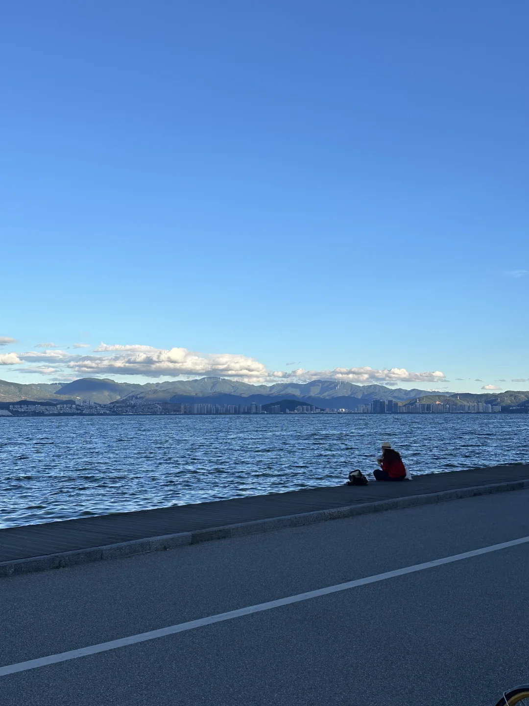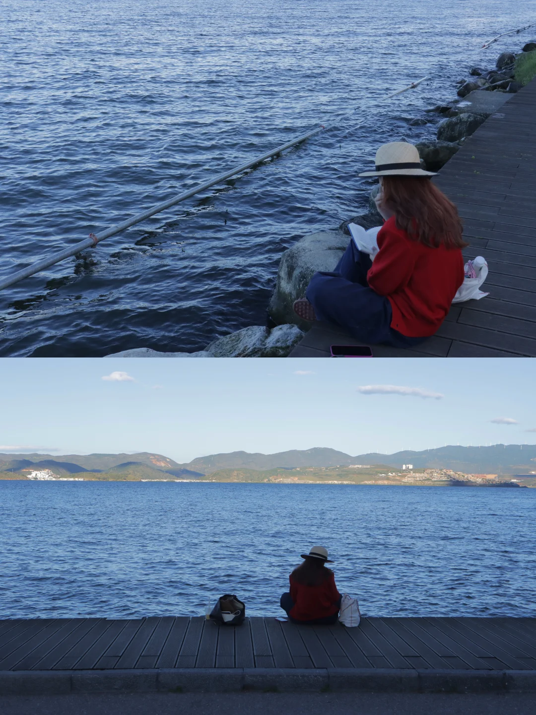 两个时间段特别打动我,一次在早上九点前,一次在下午五点后。晨光温柔明亮,远处的玉带云缠绕在苍山腰间,近看芦苇在闪闪发光。傍晚蓝调时分,山和水和人,整个世界都变蓝了。坐在海边只觉得这片水域像个老朋友一样静静地陪伴着,很是舒服
