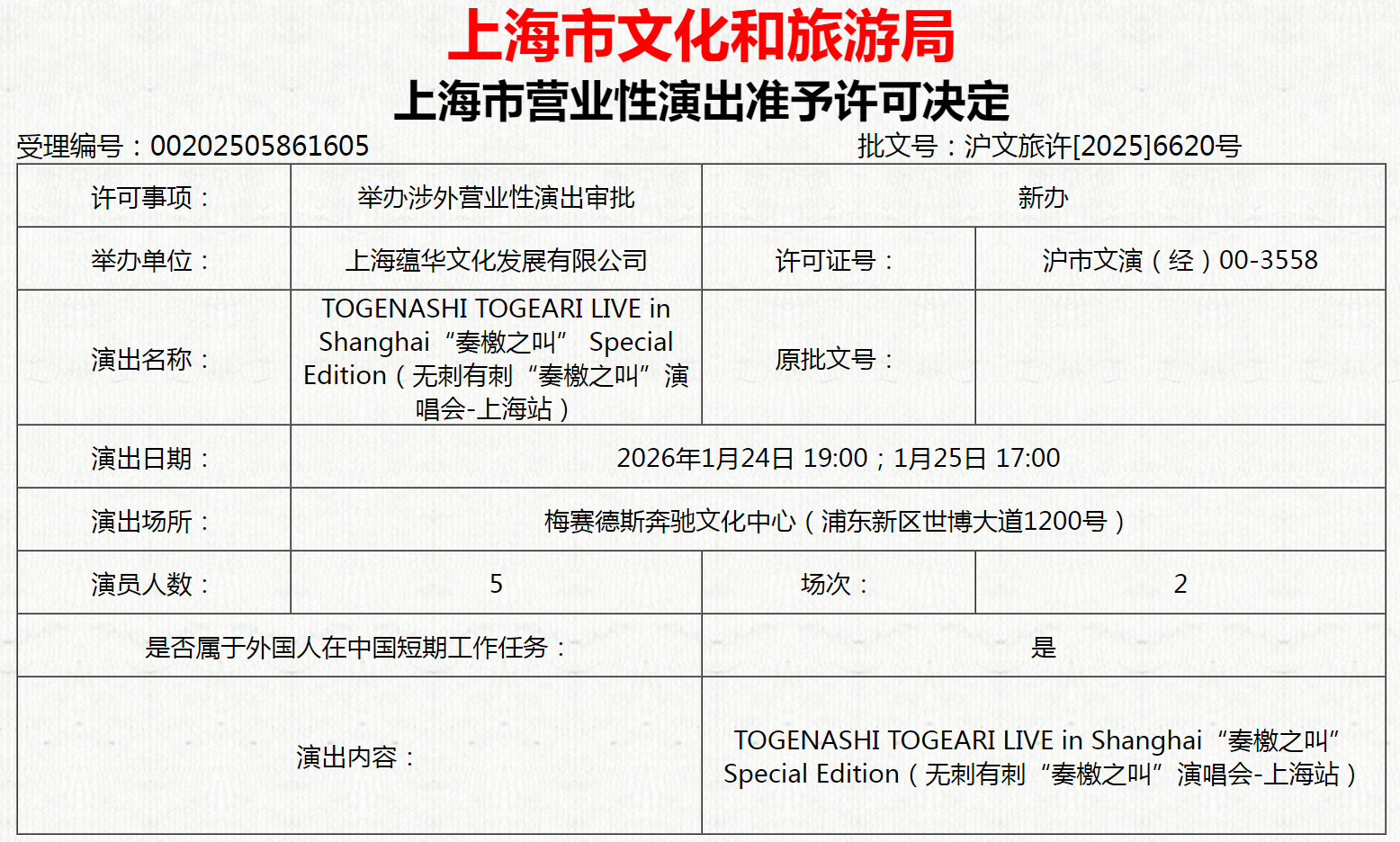 无刺有刺「奏檄之叫演唱会上海站」已通过审批,预计将于2026年1月24日、25日在梅赛德斯奔驰文化中心举办。
