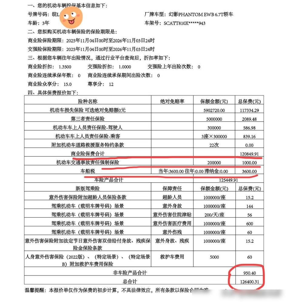 交强险1000元,车船税3600元,商业险120849元,驾乘险950元,保费合计126400元,这是第四年的车险报价。 最近帮朋友看车险,发现过户车的保费确实有点“坑”。朋友这台车因为过户了,交强险折扣直接回到1(也就是没折扣),商业险折扣更涨到1.35。对比正常没过户的油车,第一年商业险折扣1,不出险的话,第二年0.68,第三年0.595,第四年0.51,第五年0.425——第四年保费差不多能砍到首年的一半。但过户这一操作,直接把折扣规律打乱了。 其实车险折扣挺复杂的,除了过户,出过险、车主年龄、同款车的出险率都会影响。保险公司也不是随便定价,毕竟要覆盖风险、保证盈利,不然赔多了谁还敢做这生意? 作为普通车主,咱能做的就是多对比几家报价,弄清楚折扣变化的原因。保费高不一定坑,关键看保障是否匹配需求;保费低也别盲目选,得确认免责条款和理赔服务。毕竟车险这事儿,买的是安心,不是单纯比价格。