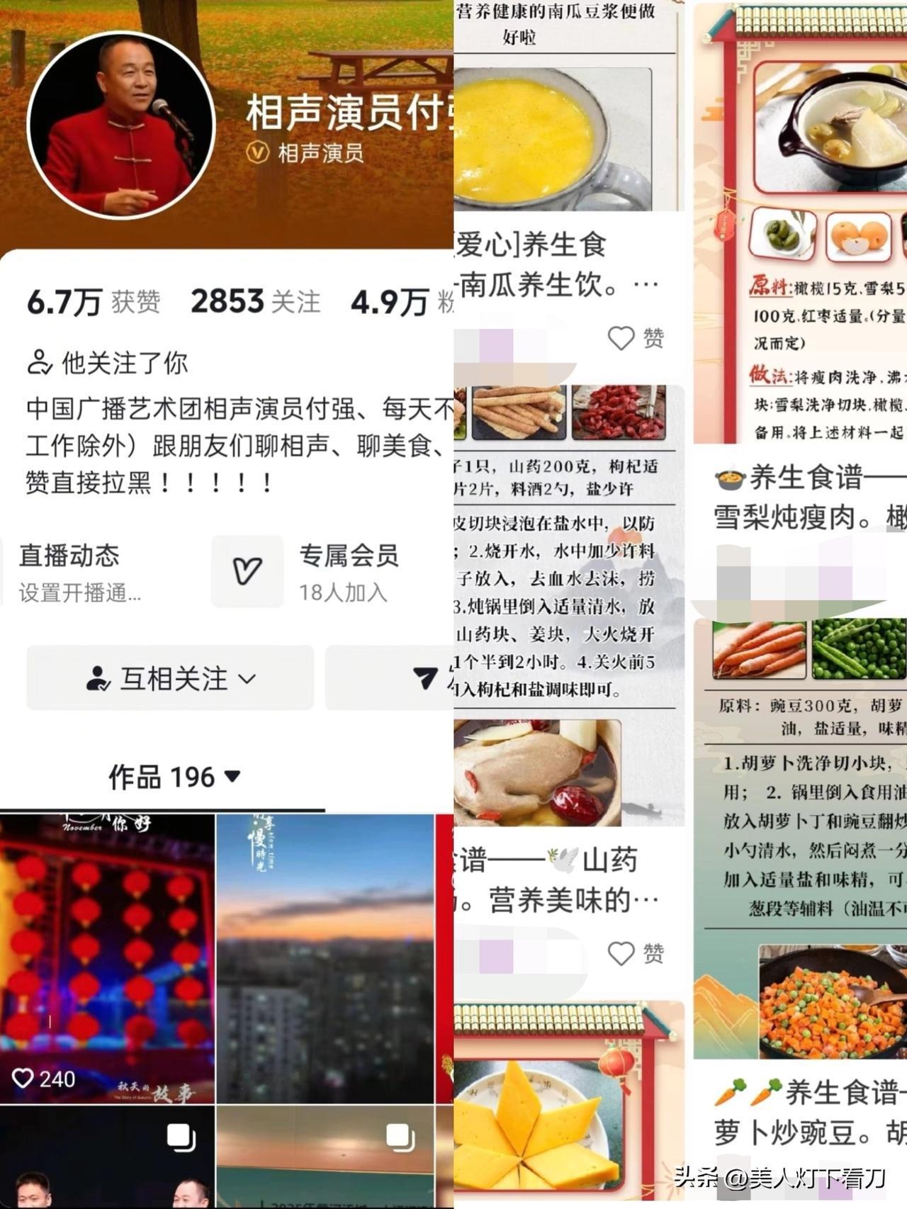 相声演员关注女粉丝有啥目的? 今日,相声演员付强,社交账号关注某女粉丝,该女生激动发文表示:头一次有明星关注我,太开心了! 本以为这女生账号满屏都是大长腿,结果点进去一看,其作品没有任何女生照片和视.频,齐刷刷全部都是饮食小妙招和养.生食谱! 我承认是我思想龌蹉了,付强老师今年五十有六,确实也到了该注重饮食营养的年纪。 由此我得出一个结论,不是所有相声演员都如郑好老师热衷大白腿的,像关注我表妹的常九爷就是为了看她写的水浒故事,关注了这位女生的付强老师就是为了学她科普的养.生知识,关注了又取关了戏校女学生和车模的郭老师,就是为了培养戏曲人才和想买新车。 嗯嗯,一定是这样的!