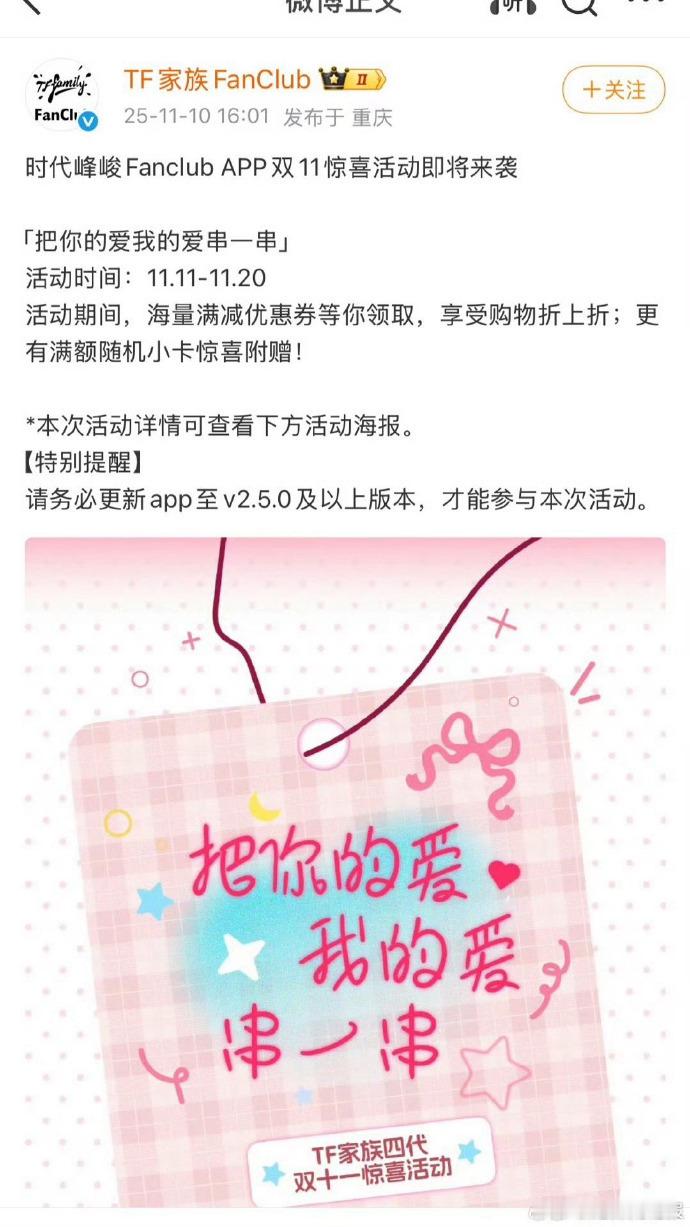 时代峰峻以双 11 为契机,通过 fanclub 推出惊喜活动,福利设置亮点十足。专属互动打破常规,传递品牌温度,深化与粉丝的联结。时代峰峻双11惊喜活动时代峰峻fanclub双11惊喜活动