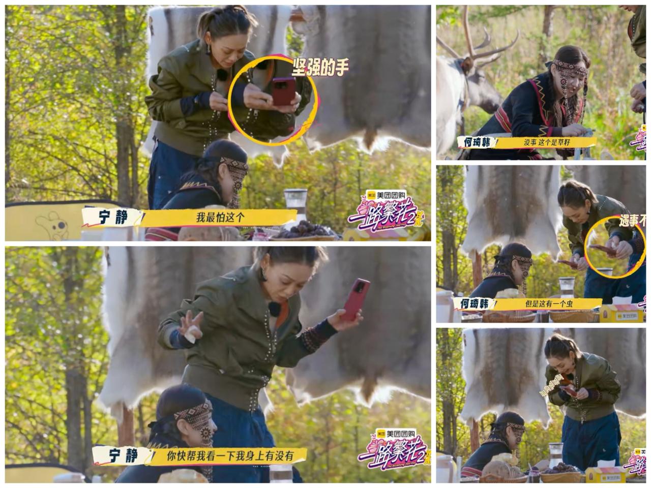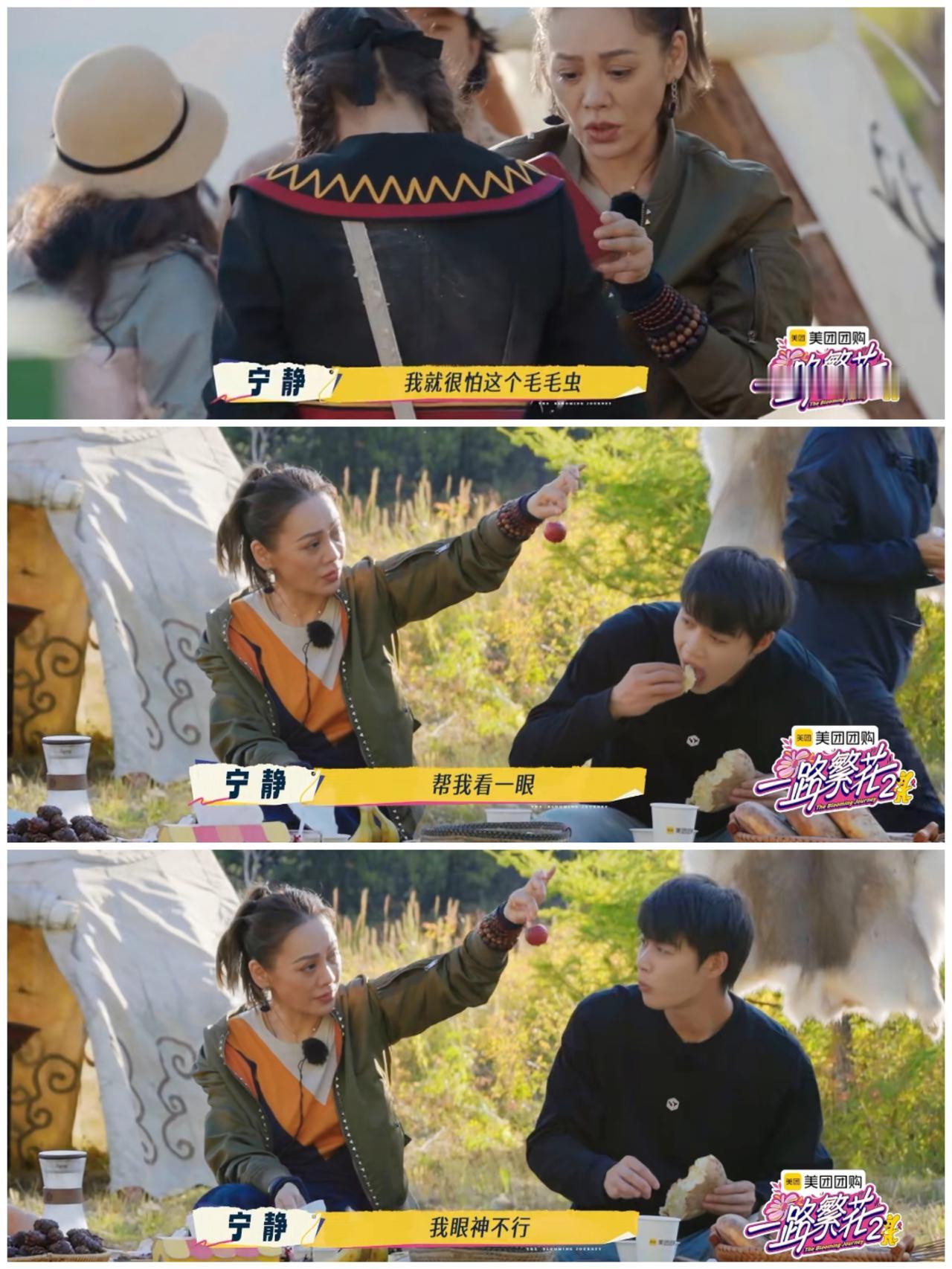 看了宁静的内蒙古大草原的经历, 知道她与卢靖姗相比, 输的不一点半点。 在网友的印象里, 宁静都是霸气大女主, 给人一种天不怕地不怕的感觉。 但是宁静看到水果周围的 草籽时, 就以为是毛毛虫, 赶紧叫当地人过来处理。 结果在草籽下面真的有一条毛毛虫, 吓得宁静连连尖叫。 还让其他人看看她身上 是否有毛毛虫, 做全身检查。 她想吃水果, 但是她有老花, 就请柯淳帮忙检查 水果上面是否有毛毛虫。 而卢靖姗在国外拍节目, 看到花园里有十一条毛毛虫 连在一起, 不但没有惊叫, 而且叫韩庚过来一起欣赏。 觉得它们是一家人在玩耍。 是呀, 别看宁静那么霸气, 她也有自己的弱点。 而且美女怕毛毛虫, 就让男生容易产生一种保护欲, 未尝不是一件好事。 有些女生为了让男生展示“男友力”, 明明不怕毛毛虫, 还特意假装自己怕, 来给对方展示的机会。 也许面对自己喜欢的人, 女生会特意展示自己柔弱的一面吧, 也许有些男生就吃这一套吧。 但是相对于女生的柔弱, 我更加欣赏卢靖姗的“强大”, 韩庚和她在一起会是一对 势均力敌的伴侣, 他们似乎可以共同面对 人生的任何风雨。
