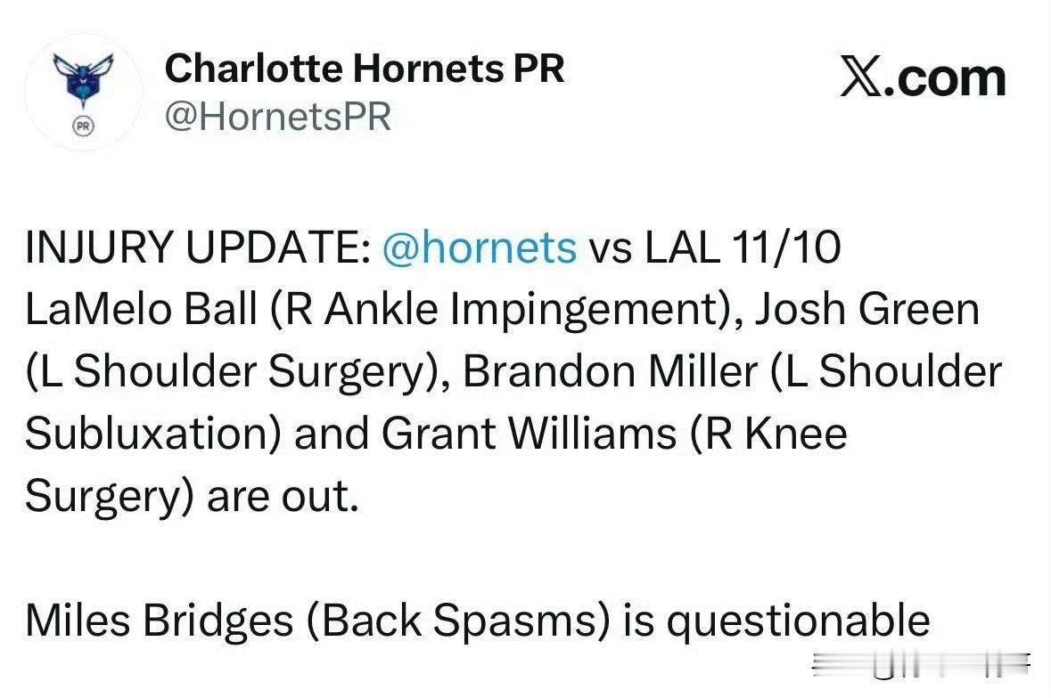 湖人对阵黄蜂比赛预告!!!湖人vs黄蜂比赛预测,湖人被看好! 北京时间11月11日一大早八点钟,湖人将开始第二个客场之旅,他们来到夏洛特打黄蜂,目前双方的伤病报告和比赛预测已经公布,一起来看下吧。 目前从ESPN给出的比赛预测结果中,湖人以超6成的概率拿下比赛,可以说被外界十分看好,主要还是因为伤病名单吧。 湖人方面,里夫斯有可能复出;而黄蜂方面,三球、米勒两个后场都打不了,还有格威以及格林也都将伤缺,小乔和里夫斯差不多的情况,也是有可能打。 目前看到黄蜂主力伤缺这么多,ESPN也是给出了他们主场+7.5,预计湖人大概能胜出接近10分吧,黄蜂毕竟实力不如老鹰,这个胜率应该不至于被翻了吧。 nba 湖人 湖人赛程 湖人阵容名单 湖人