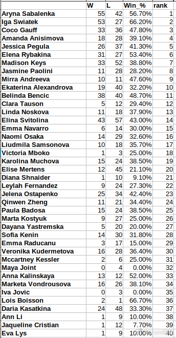 目前女单TOP40对TO10的胜率,布瓦松高居第一,斯瓦泰克第二!