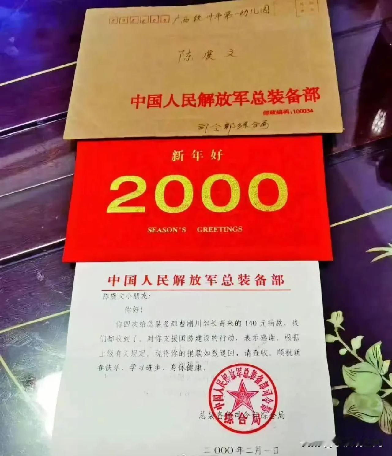 1999年,小朋友给国家四次捐款140元,用于建造航母,总装专门回信退款并表扬他
