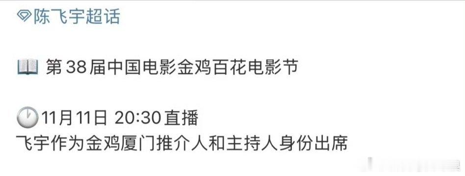 陈飞宇将以金鸡厦门推介人和主持人身份出席第38届中国电影金鸡百花电影节!这次身份好多[good]