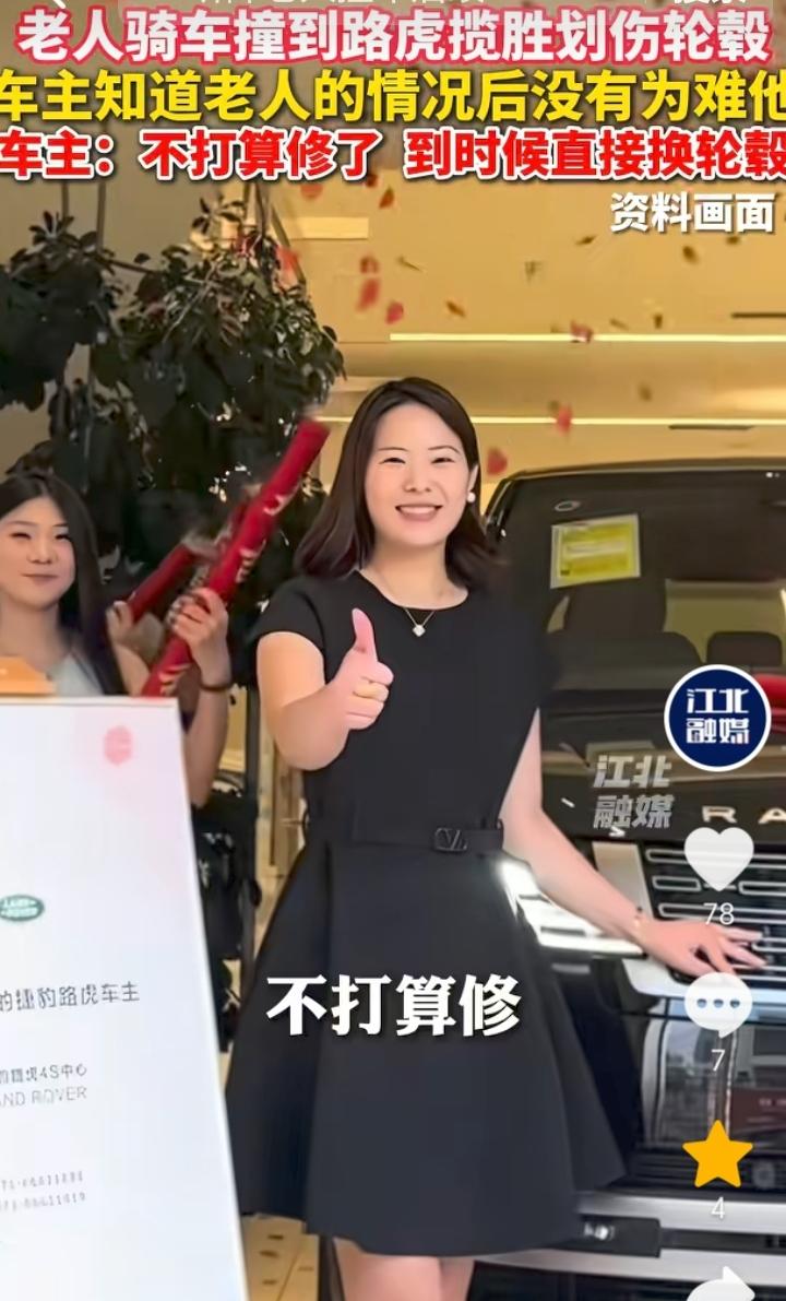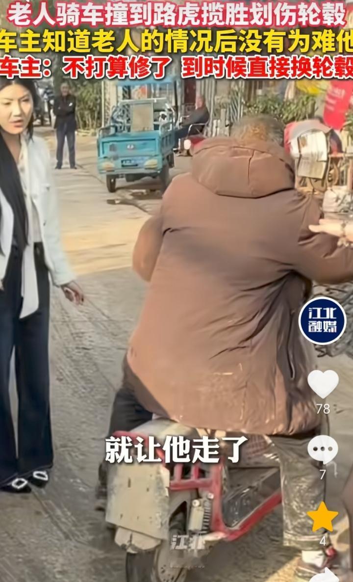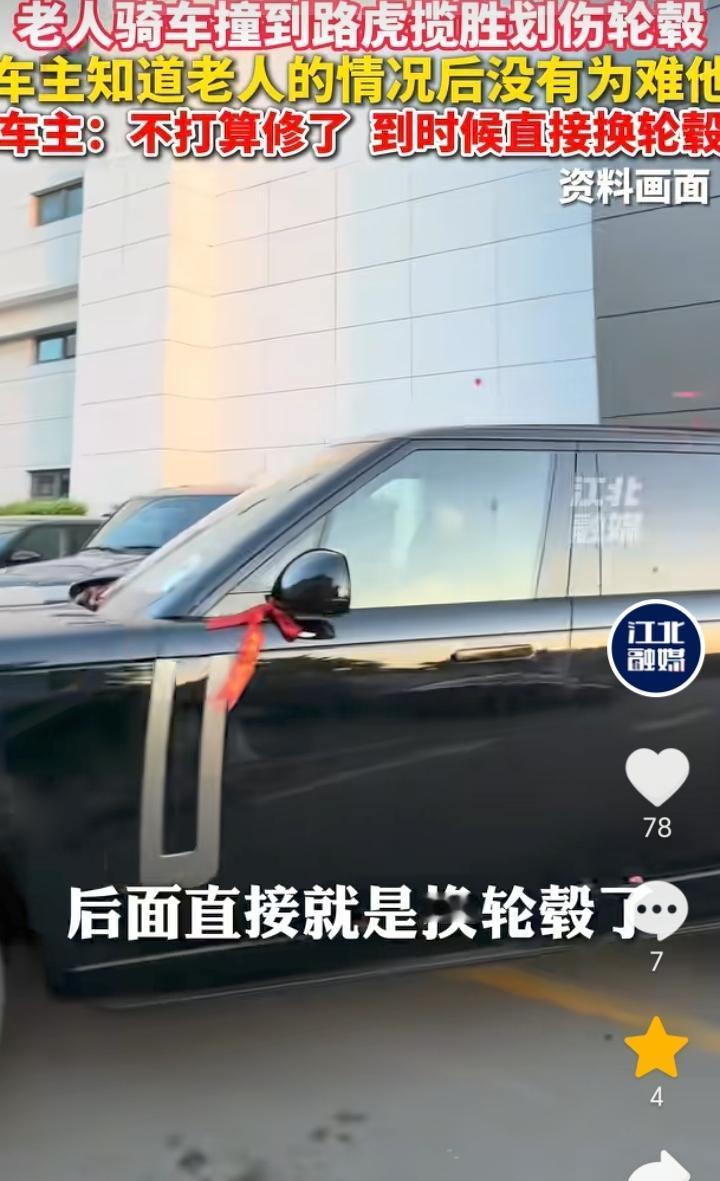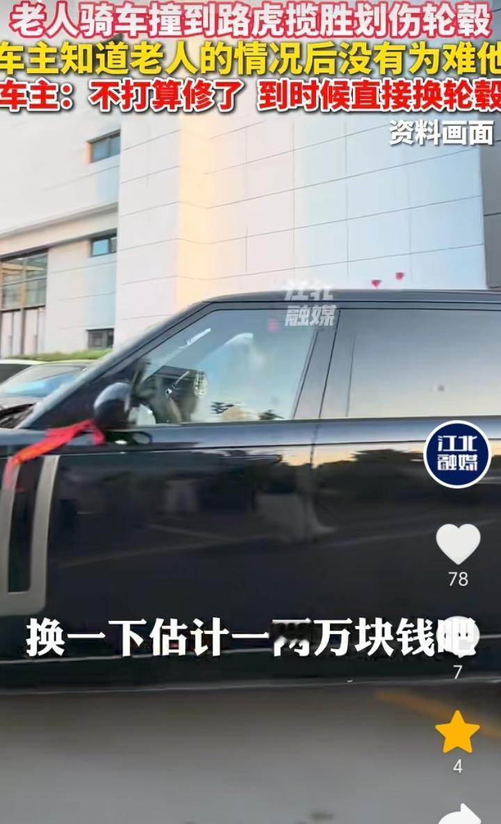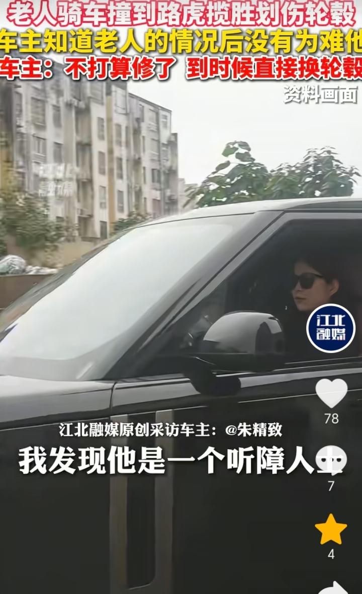 人美心善!河南开封,老人骑车撞上了一辆路虎揽胜划伤轮毂,车主下车后发现老人是一个听障人士不会说话,车主看了下轮毂伤痕连忙说没事,然后让老人离开。车主表示,轮毂掉漆了,不打算修,后面直接换轮毂了,估计一两万元。 听障老人骑车划伤路虎揽胜,那肯定也是不小心导致,就算让赔偿可能老人也是拿不出钱来,好在车主人美心善,发现老人是听障人士后直接让对方离开,真是应了那句,能开起豪车的人格局素养就是不一样。 虽然说老人不管是有意或者无意划伤路虎揽胜,但是事实就是车轮毂被划掉漆了,可能有人会觉得既然能开起豪车也不差那点钱,话是这样说但是人家钱也不是大风刮来的,就算让赔偿那也可以理解,不过结局很暖心,这也说明了还是好人多。 不管是路上开车还是骑车都要小心谨慎,避免和其它车辆发生剐蹭。