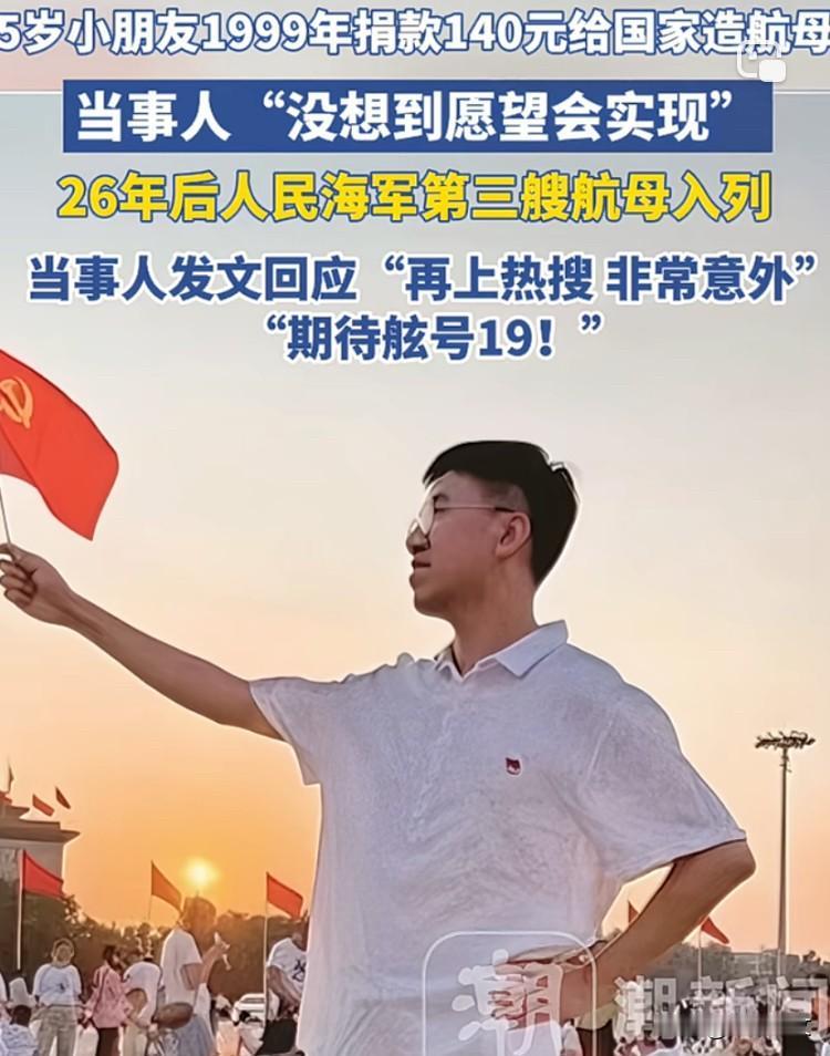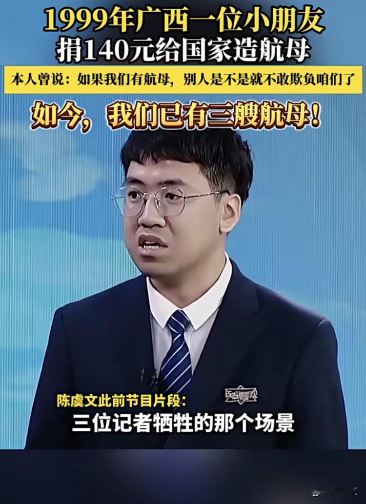 1999年,中国人民解放军总装备部收到了4笔特殊的捐款。 4笔捐款来自同一个人,总共140元。 之后,总装备部竟然将捐款如数退回了,还特意写了表扬信! 原来,捐款人竟然是一个年仅5岁的男孩,名为陈虞文,是广西钦州人。 那一年,5岁的陈虞文在电视上看到中国驻南联盟大使馆被北约轰炸,3名记者牺牲的新闻。 小小年纪的他就在想:如果我们也有这个航母,别人是不是就不敢欺负咱们了! 于是,陈虞文向当过军人的父亲诉说了自己的悲愤。父亲得知后,欣慰地告诉陈虞文可以向国家捐款造航母。 从这之后,陈虞文开始攒钱,在父亲的陪伴下前往邮局寄出了自己的“愿望”。前后寄了4次,一共140元。 当中国人民解放军总装备部得知此事后,他们深受感动。 在2000年初,总装备部写信向陈虞文表示感谢以及表扬,并按照规定将捐款如数退还。 如今过去了26年,我们中国已有了三艘航母。 5岁稚子航母梦,26载终实现! 这不仅仅是一位孩童的梦想成真,更是中国海军从近岸防御走向远海护卫的缩影。