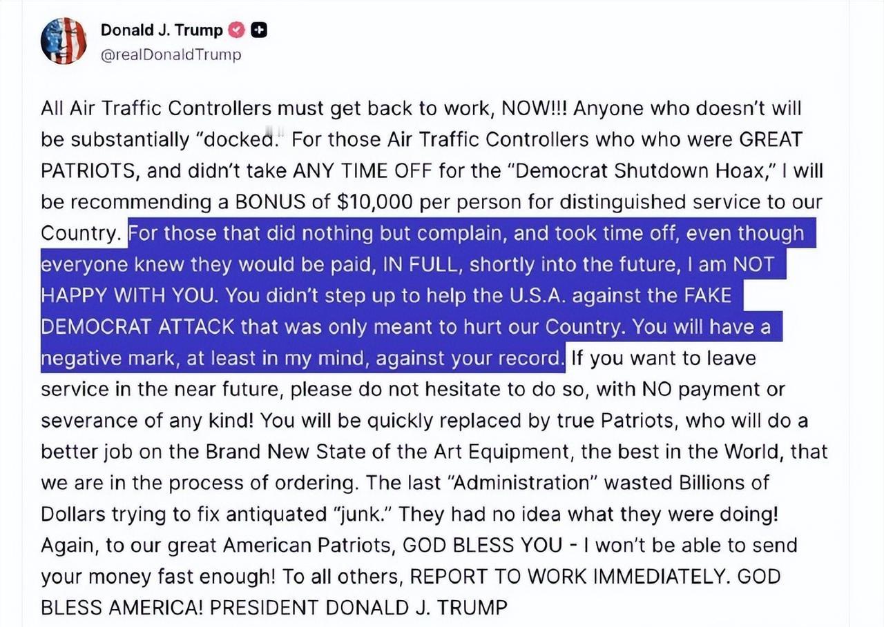 【特朗普:空中交通管制员都回来上班!】 不久前唐纳德·J·特朗普发文: 所有空中交通管制员必须立刻返岗!!!不返岗者将被大幅“扣薪”。对于那些在“民主党停摆骗局”期间一天没休、表现卓越的伟大爱国管制员,我将建议每人发放一万美元奖金,以表彰他们对国家的杰出贡献。 至于那些只知道抱怨、还休假的人——明明大家都知道工资很快会全额到账——我对你们非常不满。你们没有挺身而出,帮助美国对抗这场旨在伤害我们的假民主党攻击。至少在我心里,你们的记录会被打上负面标记。 如果想在近期离职,请立刻走人,且不会得到任何补偿或遣散费!你们会被真正的爱国者迅速取代,他们将在我们正订购的全球最先进设备上干得更好。上届政府浪费了数十亿美元去修那些老掉牙的破烂,他们根本不知道自己在干什么! 再次向伟大的美国爱国者致敬——上帝保佑你们,我会尽快把奖金送到你们手上! 其他人,立刻返岗。 上帝保佑美国! 唐纳德·J·特朗普