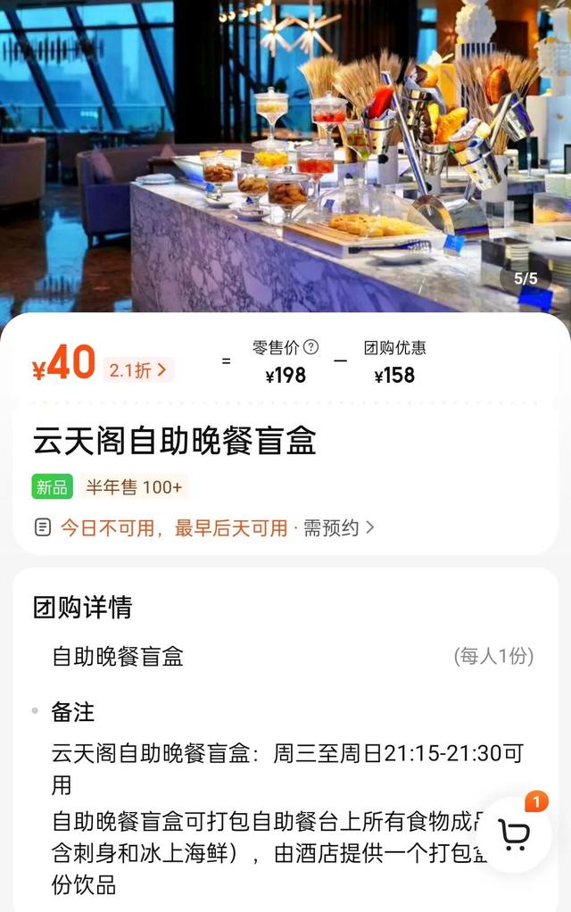 记者在平台上查询了解到,这家五星级酒店最贵的豪华套房标价2762元一晚,最便宜的房型761元一晚。酒店的云天阁餐厅,人均消费262元,自助晚餐盲盒已售超100份,自助早餐盲盒已售75份。