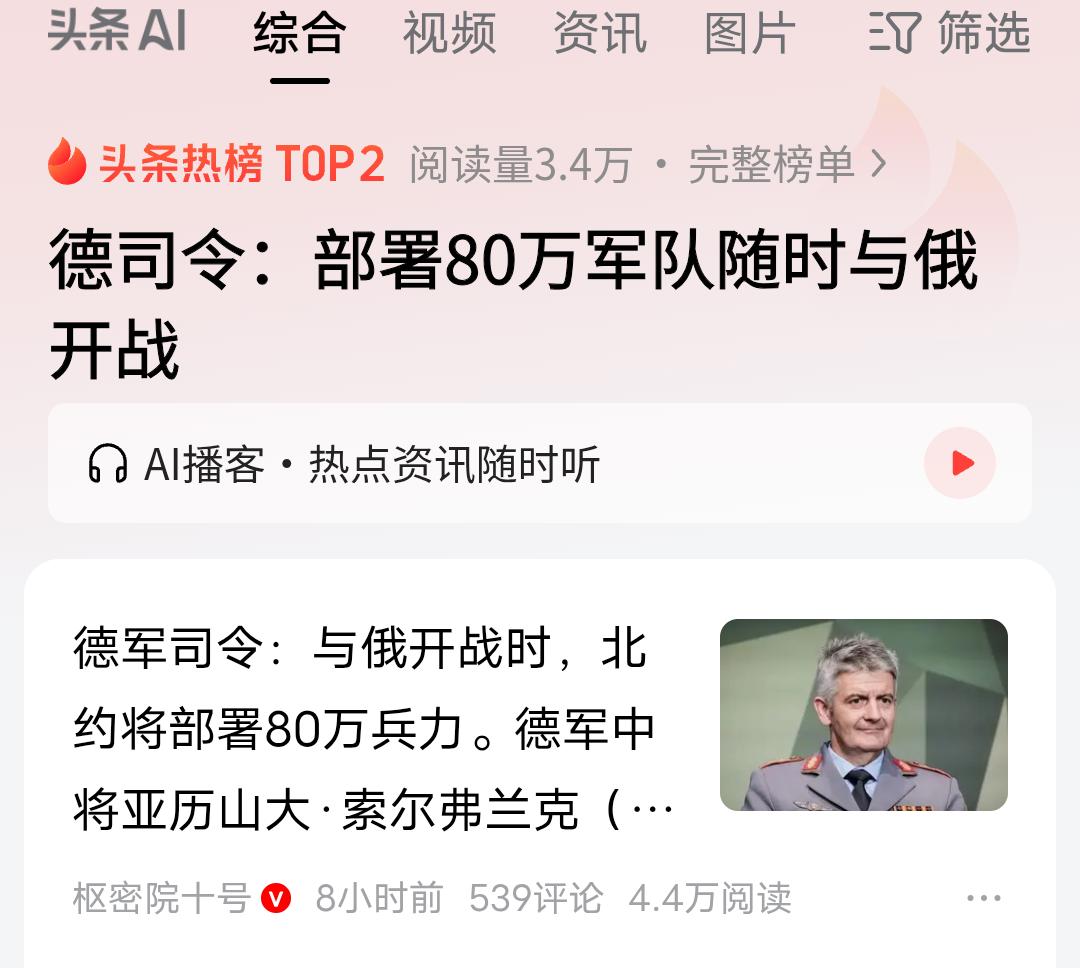 这是真的要打起来吗? 德国联合行动司令部司令亚历山大·索尔弗兰克中将表示,已经做好与莫斯科开战的准备,并随时准备协助向俄罗斯边境部署80万北约部队。 不过俄乌战争大家也都看到了,只要战争开启,想要结束就很难了。 而且欧洲这边打起来,恐怕也是东大和美国想要看到的,那是不是我们可以坐收渔翁之利呢? 不过大国之间他有自己的考量,也不会轻易开打的!