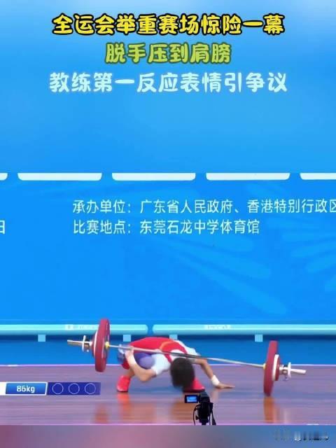 全运会举重赛场惊险一幕!脱手压到肩膀,教练第一反应表情引争议 11月10日讯 在刚刚举行的全运会举重女子45公斤抓举项目中,福建队徐璐莹第三次抓举86kg出现失误,杠铃直接从背后脱手压到了肩膀,随后躺倒在地。