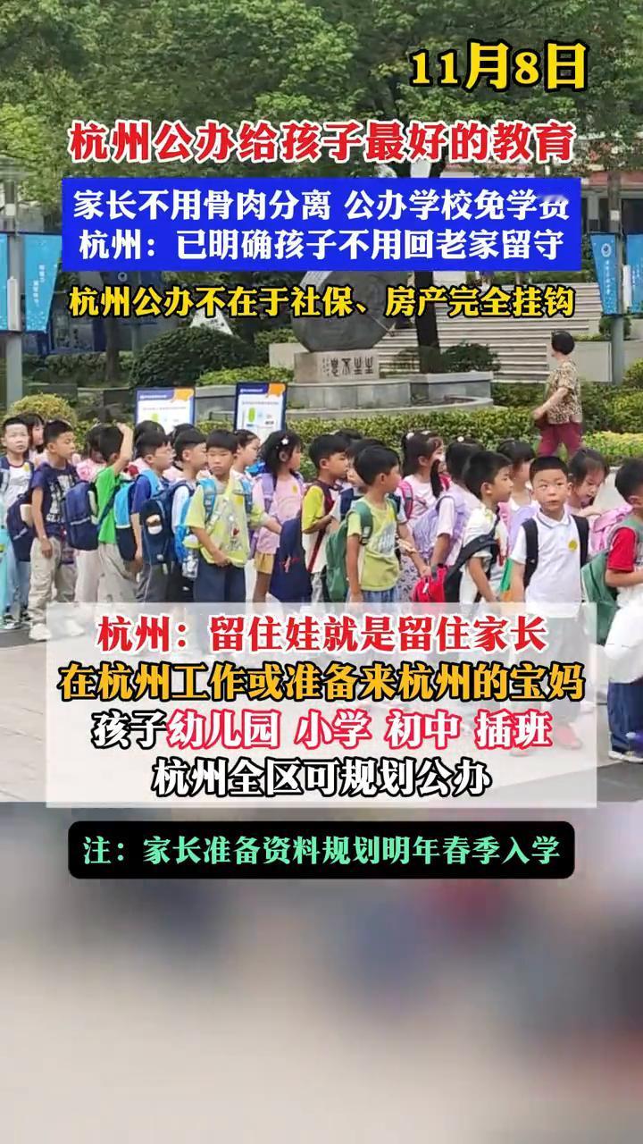 11月8日,杭州公办给孩子最好的教育,家长不用骨肉分离,公办学校免学费。 杭州:已明确孩子不用回老家留守,公办不在于社保、房产完全挂钩。 杭州:留住娃就是留住家长。在杭州工作或准备来杭州的宝妈,孩子幼儿园、小学、初中插班,杭州全区可规划公办。 注:家长准备资料规划明年春季入学。