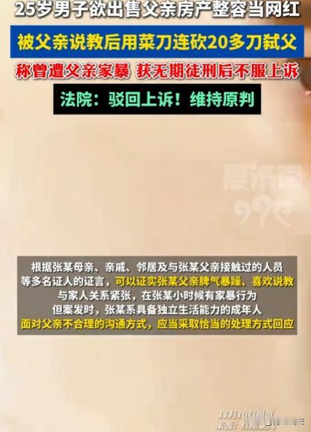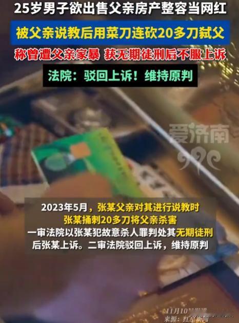 安徽25岁的张某,自幼遭受父亲家暴,心中一直怀有怨恨。长大后,张某为当网红,多次去整形,还想卖掉父亲住的房子继续整形,被父亲拒绝后,父子矛盾愈发严重。 2023年5月,案发当天,父亲来到张某住处,本意是想对儿子近期种种出格行为进行说教,可谁也没想到,这番平常的家庭沟通,竟成了催命的符咒。 张某早已在暗处准备好了菜刀,他盯着父亲,眼中满是疯狂与决绝,当父亲开口说话时,他突然暴起,手持菜刀猛砍父亲头部、面部。 父亲发出痛苦的惨叫,但张某并未停手,在砍击数刀后,他更换了刀具,继续向父亲的颈部猛割。父亲当场断了气。 杀完人后,张某没有慌乱逃跑,而是开始清理现场,他试图抹去一切犯罪痕迹,仿佛这样就能掩盖自己犯下的滔天罪行。 清理完现场,他竟把这事告诉了母亲,母亲听闻后,立刻报了警。很快,民警赶到将张某抓获。 案件进入司法程序后,经一审法院审理,认定张某构成故意杀人罪。张某提前准备凶器,明显是预谋杀人。在杀人过程中,手段残忍,情节恶劣。 一审法院在量刑时,考虑到这是由家庭纠纷引发,亲属及时报案,而且被害人亲属也表示了谅解,基于这些情况,一审判处张某无期徒刑。 张某对一审判决不服,提出了上诉。 在上诉时,他抛出两个关键点:一是称自己有自首情节,二是说父亲有过错。 张某认为,案发后自己未逃离现场,应视为自首。而且父亲从小家暴他,这案子发生,父亲得负很大责任。 检方和二审法院却不这么认为,对于自首情节,二审法院经过详细调查发现,张某不是主动投案。 案发后,张某虽滞留现场,但并非在明知他人已报警的情况下等待,而是在家属的劝说下未逃离,其被抓过程缺乏自愿性和主动性,故不构成自首。 自首的认定有严格标准,根据《刑法》第六十七条规定,犯罪以后自动投案,如实供述自己罪行的,是自首。自动投案要求行为人出于自己的意志主动将自己置于司法机关的控制之下,并接受审查和裁判。 张某的行为,显然不符合这一要求。 张某声称父亲有过错,二审法院审理后认定,虽然其父亲脾气暴躁、有过家暴行为,但在案发前,并未实施违法犯罪或明显不当行为。 日常言语不当等情况,远远达不到刑法上所规定的过错程度。 刑法中的被害人过错,是指被害人在实施违背社会伦理或违反法律的行为时,激化矛盾引发犯罪。 本案中,父亲虽有历史问题,但案发时并无直接过错行为引发张某杀人,所以不能认定被害人存在刑法意义上的过错。 张某自幼遭受家暴,导致心理扭曲,是否应据此从轻处罚? 从法律层面分析,尽管家庭环境可能对张某的心理造成影响,但这绝非其杀人的合理借口,每个人都需对自己的行为承担责任,不能因曾遭遇不幸而逃避法律制裁。 张某上诉称有自首情节,法院认定不构成自首,那如果张某当时主动报警并等待民警到来,算不算自首? 根据刑法规定,这种情况下,犯罪嫌疑人主动将自己置于司法机关控制之下,如实供述罪行,就符合自首条件,应当认定为自首。 本案中,家庭矛盾在所难免,但绝不能成为伤害他人的借口,当面对家庭纠纷时,应保持理智,通过合法合理的途径去解决问题,而不是让冲动和愤怒冲昏头脑,做出无法挽回的错事。 二审法院认定张某故意杀人罪成立,虽然张某有家庭矛盾、亲属报案及谅解等情节,但他故意杀人的犯罪事实无法改变。最终,维持了一审的无期徒刑判决,此裁定为终审裁定。