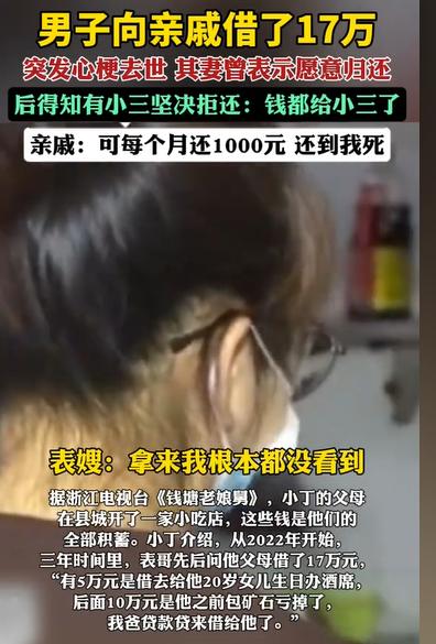 浙江,男子要给20岁的女儿办生日,向亲戚借了5万,后面他包矿石亏了,又向亲戚借10万,亲戚贷款借给他,可这10万元刚借没几天,男子就心梗离世了,亲戚便让男子的妻子还钱,一共17万,结果男子的妻子得知男子早就背叛了她,她和女儿坚决不还钱,亲戚很无奈,哀求道:可以每个月还1000元,直到她死为止。 “不是我借的钱,为什么要让我来还?” 刚刚听到这句话,还想反驳一句,虽然不是你出面借的钱,但这是夫妻双方共同的债务,无论如何也得还给债主吧? 可是女子接下来的一句话直接就让讨债者不知所措。 “这钱他没有给我,是给外面的第三者了。” 这场纠纷到底是怎么一回事儿?最终这笔债务又该算到谁的头上呢? 说起这个纠纷,真是让小丁头疼,平时他们一家人和表哥家走动得十分频繁,你家有难我家帮,更是不说二话的事情。 前一阵子表哥来找小丁的父母借了五万块,当时说是给女儿办生日宴,手里的钱暂时周转不开,能不能先借个几万块,老两口二话不说就转给了外甥五万。 表哥是做矿石生意的,有时候突然借钱啥的过个三五个月也就还了,这一次又找到小丁的父母,说现在急需十万块,看他们能不能帮忙。 现在的钱不经花,小丁的父母手里没有多少钱,又不好抚了面子,他们只好找了贷款机构又借了十万块。 按理说,这样的亲情实在是太珍贵了,可谁也没想到,让小丁意料不到的事情发生了。 表哥突然心梗,不幸去世了。 这可咋办啊?人虽然没了,但债还在,小丁家是贷款借出来的钱,每个月还得还本金利息,现在表哥不在了,这钱得要回来啊。 小丁找到了表嫂,希望表嫂能够将这个债务承担。 痛失爱人,表嫂当场没有拒绝小丁一家的请求,表示夫妻一场,他既然有债我就替他背了。 可过了几天,表嫂突然反悔了,说无论如何都不会掏出一分钱。 这到底是咋回事儿? 原来,表嫂无意间发现,自己的丈夫竟然还在外面包养了一个第三者,他借过来的钱也全都花在了那个女人的身上,所谓的升学宴更是男人的借口。 在表嫂看来,既然这钱没有用于家庭,就没有还的道理,如果他们真想把钱要回来,那就去找第三者,反正和她没啥关系。 要不然就打官司,看这笔钱到底由谁负责。 小丁的父母更是为难,当初也是信任自己的外甥,所以连欠条都没有打,他们只能把希望寄托在法庭上,希望能有一个比较圆满的结局。 现实生活中,我们常常抹不开面子,都是一起长大的或是看着长大的情分,可一旦借出去的钱回不来,损失的还是自己的利益。 这件事情也提醒我们,借钱给亲戚无可厚非,但我们还是应该多一个保护自己财产的举措,比如写个借条,或者转账的时候加上一个备注。 别闹到最后,钱没了,情分也没了。 对于这件事,您有什么想说的吗?欢迎评论区留言讨论。 信息来源: 浪涨新闻 2025-11-10 浙江一男子突发心梗去世 随后爆出17万债务 其妻子拒还款